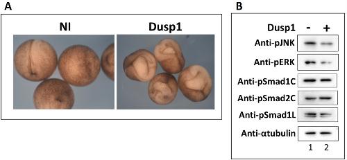 Figure 2. Overexpression of dusp1 mimics the DNFR function. (A) Dusp1 mRNA (3 ng/embryo) was injected at the 4 cell stage in dorsal half and harvested at stage 15 to identify the morphological change as compared to that of control (uninjected whole embryos). (B) Dusp1 (3 ng/embryo) was injected and harvested at stage 11-11.5. Immunoprecipitation was performed with pJnk, pErk, pSmad1C (c-terminal), pSmad1L (Linker region), pSmad2C (c-terminal) and α-tubulin was included as a control (α-tubulin being a housekeeping protein).