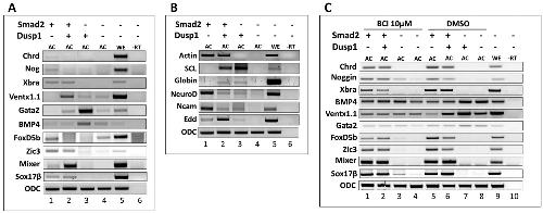 Figure 3. Dusp1 inhibits Smad2 mediated dorsal mesoderm (organizer) in AC. (AâC) Smad2 mRNA (1â ng/embryo) was injected separately or co-injected with dusp1 (3â ng/embryo) at the one-cell stage, followed by dissection of the AC (AC) and harvested at stage 11-11.5. Relative gene expression was analyzed by RT-PCR. (C) BCI 10â µM (Dusp inhibitor) and DMSO as control, treated at stage 8.