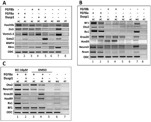 Figure 4. Dusp1 inhibits Fgf8 induced neural induction and modulates anterior-posterior patterning of neural tissue formation. (AâC) Fgf8a and fgf8b mRNA (1â ng/embryo) were injected separately or co-injected with dusp1 (3â ng/embryo) at the one-cell stage, followed by dissection of the AC (AC) at stage 8 and harvested at stage 11 and 24. RT-PCR was performed to examine the expression of target genes to compare with the control (uninjected AC), (C) BCI (Dusp1 inhibitor, 10â µM and DMSO as control) treatment at stage 8.