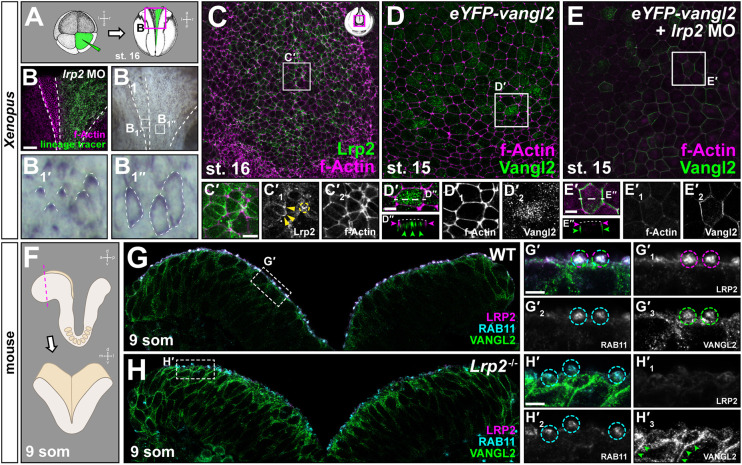 Fig. 5. Lrp2 is required for planar cell polarity and regulates subcellular localization of Vangl2. Analysis of planar cell polarity in embryos en face (A-E) and on sections (F-H). (A) Scheme for injection of morpholino oligomer (MO) targeting lrp2; area for analysis at stage (st.) 16 in B is indicated by a box. (B) Dorsal view of mid-/hindbrain area; the width of the neural plate is greater on the injected side, F-actin delineates cell borders. (B1) Bright-field image of same embryo shows pigment granule localization towards the anterior in uninjected control cells (B1â²); circumferential distribution is seen in apically wide morphant cells (B1â³). (C) Beginning of asymmetric Lrp2 distribution; F-actin delineates cell borders. (Câ²) Magnification of area indicated in C; there is medio-anterior distribution of Lrp2 (arrowheads in Câ²1), which is also seen in apically constricted cells (circle in Câ²1). (Câ²2) F-actin single channel. (D,E) eYFP-vangl2 injected into the A1 lineage in 4- to 8-cell embryos, detected at stage 15 using immunofluorescence for GFP and F-actin staining. Dotted pattern of eYFP-Vangl2 expression (6/6 embryos; D,Dâ²; magnification of inset in D), which is located subapically in vesicle-like structures (green arrowheads in Dâ³; optical section indicated in Dâ²; magenta arrowheads indicate f-Actin belt). Upon lrp2 MO injection, Vangl2 localized at cell borders (7/9 embryos, two independent experiments; E,Eâ²) and subapically in the basolateral membrane (green arrowheads in Eâ³, optical section as indicated in Eâ²; magenta arrowheads indicate f-Actin belt). (Dâ²1,Dâ²2,Eâ²1,Eâ²2) Single channels. (F) Schematic illustrating the level of transverse sections in G,H. (G,H) LRP2 and VANGL2 distribution at the 9-somite stage. (Gâ²,Gâ²1-3,Hâ²,Hâ²1-3) Higher magnifications of the areas indicated by the boxes in G,H, and single channels thereof. Apical colocalization (dashed circles) of LRP2 and VANGL2 in RAB11-positive compartments occurs in wild type (WT; G,Gâ²) compared with absence of VANGL2 from RAB11-positive compartments in Lrp2â/â cells (H,Hâ²); arrowheads in Hâ²3 indicate relocalization of VANGL2 to the basolateral membrane. l, left; p, posterior; r, right; v, ventral. Scale bars: 100â µm in B; 10â µm in Câ²,Dâ²,Eâ²; 5â µm in Gâ²,Hâ². |