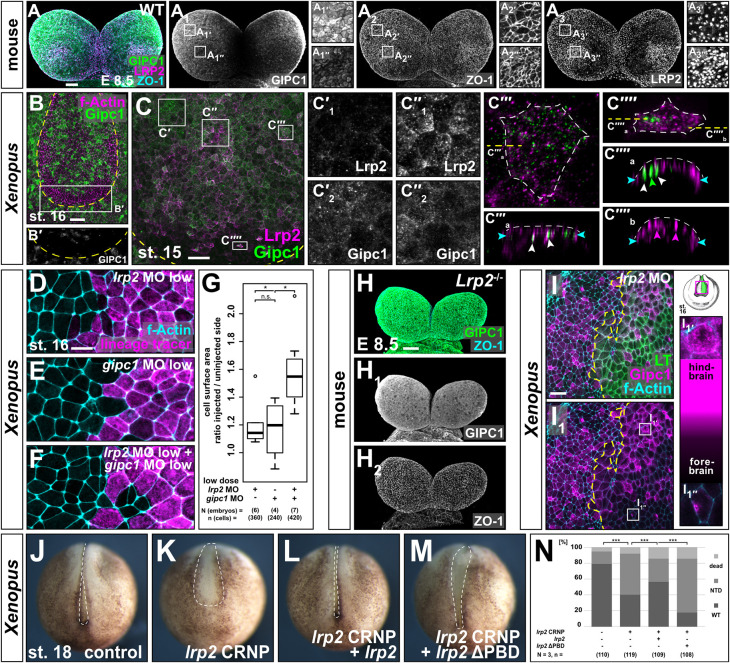 Fig. 7. Lrp2 mediates apical constriction by functional interaction with Gipc1. (A) Frontal view of wild-type (WT) mouse forebrain area at E8.5 (7 somites). Immunofluorescence (IF) staining reveals localization of GIPC1 and LRP2; ZO-1 marks cell borders. (A1-A3) Single channels. (A1â²-A3â³) Magnification of areas indicated in A1-A3; differential GIPC1 intensities exist between large and constricted cells. (B,C) Frontal views of stage (st.) 16 (B) and stage 15 (C) embryos; dashed line indicates the anterior limit of the neural plate; immunofluorescence reveals the spatially dynamic localization of Gipc1 (B) and spatially dynamic colocalization of Lrp2 and Gipc1 (C). (Bâ²) Single channel of Gipc1; higher magnification of the area indicated in B. Boxed areas indicated in C are shown at higher magnification in Câ²-Câ³â³. (Câ²1,Câ³1,Câ²2,Câ³2) Single channels. Gipc1 is present in areas with low (Câ²1,Câ²2) or high (Câ³1,Câ³2) amounts of Lrp2. Dispersed distribution of Lrp2 and Gipc1 in a cell with a large apical surface (Câ³â²), also visible in an orthogonal optical section (Câ´a; indicated in Câ´); sites of Lrp2/Gipc1 co-localization are indicated (white arrowheads). (Câ³â³) Cell with a constricted surface showing Gipc1 accumulation. (Câa,Câb) Colocalization (white arrowheads) or separate localization (green or magenta arrowheads) are indicated. Blue arrowheads indicate the level of circumferential actin; dashed line indicates apical surface in Câ³â²a,Câa,Câb. (D-F) Functional interaction of Lrp2 and Gipc1 demonstrated by individual (D,E) or combined (F) injection of low-dose lrp2/gipc1 morpholino oligomer (MO); targeted cells with lineage tracer (LT) fluorescence are shown. (G) Graphical representation of results from D-F; box plot and Wilcoxon rank sum test. (H) Frontal view of LRP2-deficient (Lrp2â/â) mouse forebrain area at E8.5 (seven somites). Immunofluorescence reveals localization of Gipc1; ZO-1 outlines cells. (H1,H2) Single channels. There is homogenous GIPC1 signal throughout the neuroepithelium. (I) Mislocalization of Gipc1 in lrp2 MO-injected cells in stage 16 embryos; the magnified forebrain area is marked by a box in the schematic. Targeted cells are identified by LT; dashed line delineates targeted/non-targeted areas. (I1) Without LT. (I1â²,I1â³) Higher magnification of single cells indicated by the boxes in I1; Gipc1 increases in hindbrain and decreases in the forebrain area. (J-M) Embryos for CRISPR/Cas9 experiments selected at the one-cell stage and incubated until uninjected controls (J) reached stage 18/19. (K) Injection of Cas9 ribonucleic particles (CRNP) containing sgRNA1. (L,M) Co-injection of CRNP together with the lrp2 construct (L) or with lrp2 ÎPBD (M). (N) Graphical representation of results from J-M, Ï2 test. Cell borders in D-F,I are visualized using F-actin staining. Scale bars: 50â µm in A,C,H,I; 100â µm in B; 20â µm in D-F. |