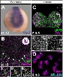 Fig. 1. Lrp2 is expressed in the neuroepithelium and increased in constricting cells. (A-D) lrp2 mRNA (A) and protein (B-D) expression analyzed by in situ hybridization and immunofluorescence, respectively. Neurula stage (st.) embryos (frontal views, dorsal upwards). (A) Neural lrp2 expression. (B) Stage 15 forebrain region; Lrp2 is expressed in most cells (outlined by F-actin); single cells with high Lrp2 levels are located along the anterior rim of neural folds (NFs; arrowheads). (Bâ²) Magnification of boxed region in B; increased Lrp2 levels are found in cells with small apical surface (circled in single channels Bâ²1 and Bâ²2). (C) LRP2 is detected throughout E8.5 anterior NFs, concentrated in areas undergoing apical constriction. Compare Câ² (constricted cells in optic evagination) with Câ³ (dorsolateral cells with larger cell surface). ZO-1 marks cell boundaries. (D) STED imaging; LRP2 is condensed around neuroepithelial primary cilia (ARL13b+) at E9.5. Scale bars: 10â µm in Bâ²,Câ²,Câ³; 1â µm in D. |