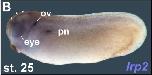 lrp2 (LDL receptor related protein 2) gene expression in X. laevis embryo, NF stage 25, assayed by in situ hybridization, lateral view, anterior left, dorsal up. |
