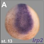 lrp2 (LDL receptor related protein 2) gene expression in X. laevis embryo, NF stage 13, assayed by in situ hybridization, anterior view dorsal up. |