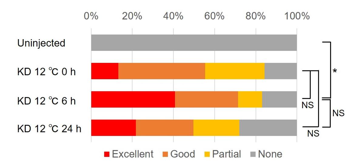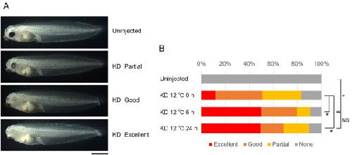 Fig. 1. Efficiency of knock-down (KD) via microinjection was improved by low-temperature incubation of embryos. (A) Representative mutants and uninjected control. The knock-down embryos were classified into 4 groups: excellent, no or very few pigments were seen; good, pigmentation present, but less than half that in the wild-type; partial, pigments were decreased, but still more than half the volume of the wild type; none, eyes and retinas were fully pigmented. Scale bar: 1 mm. (B) Frequency of pigmentation level of knock-down embryos and uninjected control (n = 44–59 in each condition. Each sample number is shown in Supplementary Table S2). Uninjected controls were kept at 12 °C for 6 h and reared at 20 °C thereafter. We carried out the same experiments twice and the number of embryos was classified in each experiment with representative results shown. Other results are shown in Supplementary Fig. S1. ∗P < 0.01, NS (not significant), Fisher’s exact test with Holm correction.