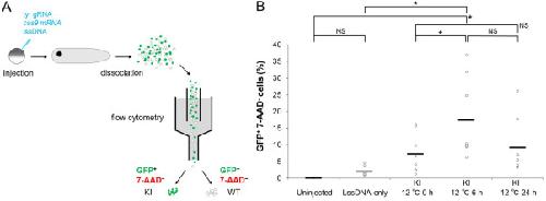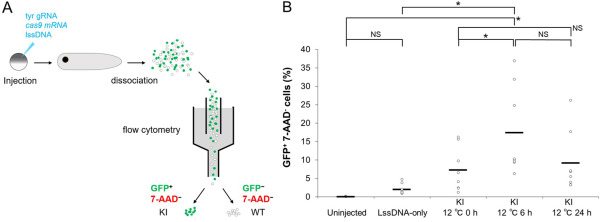 Fig. 4. Quantification of knock-in (KI) efficiency in individuals by flow cytometry. (A) Schematic drawing of the procedure for flow cytometry. (B) The proportion of GFP+ 7-AAD- cells in total 7-AAD- cells of knock-in and control embryos (n = 8 in each condition). Around 50,000 events from each embryo are acquired by FACS Canto II. ∗P < 0.05, NS (not significant), Tukey-Kramer test.