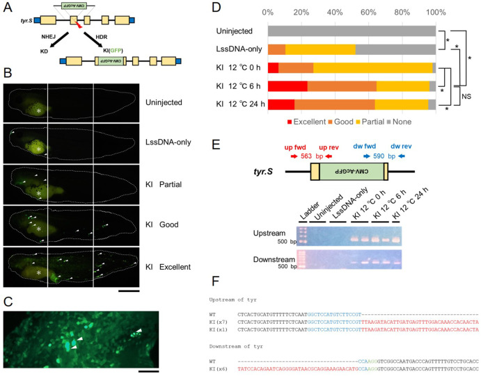 Fig. 3. HDR-mediated knock-in (KI) using the CRISPR/Cas9 system and lssDNA. (A) Schematic diagram of HDR-mediated knock-in into the exon of tyr. S. Blue boxes and yellow boxes indicate untranslated regions and coding domain sequences, respectively. (B) Representative fluorescence images of (left column) heads, (center column) trunks, and (right column) tails of (first row) an uninjected control embryo, (second row) an embryo injected with lssDNA-only, and (third to fifth row) knock-in mutants. The embryos were classified into 4 groups according to the expression level of GFP: excellent, GFP expressed widely throughout the body; good, GFP expression was seen sparsely throughout the body; partial, GFP expression was seen sparsely in specific parts of the whole body; none, no GFP expression was seen. Arrowheads and asterisks indicate strong GFP signals and autofluorescence, respectively. White dashed lines indicate outlines of embryos. Scale bar: 1 mm. (C) Higher magnification image of trunk of an “excellent” knock-in embryo showing widespread GFP expression. Note that there are many GFP-expressing cells other than those with strong GFP expression indicated by arrowheads. Scale bar: 100 μm. (D) Frequency of GFP expression level in 3 groups (incubated at 12 °C for 0, 6, and 24 h, respectively), injected lssDNA-only, and uninjected control group (n = 37–51 in each condition. Sample numbers are shown in Supplementary Table S2). Embryos injected with lssDNA-only and uninjected controls were kept at 12 °C for 6 h and reared at 20 °C thereafter. The duration of the low-temperature incubation did not affect GFP expression lssDNA-only injected groups (Supplementary Fig. S3). We carried out the same experiments 3 times and representative results are shown. Other results are shown in Supplementary Fig. S4. ∗P < 0.01, NS (not significant), Fisher’s exact test with Holm correction. (E) Schematic diagram (top) of the strategy for genomic PCR used for genotyping and representative results (bottom). (F) Sequencing of 8 (for upstream) and 6 (for downstream) knock-in embryos and uninjected control. The tyr gRNA sequences are marked in blue; both ends of the CMV-acgfp cassette are marked in red; and PAM sequences are marked in green. The entire sequences of these samples are shown in Supplementary Fig. S5.