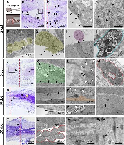Fig. 1. Cellular response to injury in Regenerative Stage. a Cartoon of spinal cord injury in NF stage 50. b, c Semithin sections of the b rostral and c caudal stumps at 2âdays post transection (dpt) stained with methylene blue. Arrowheads in panel C showed macrophages. d-i; k-m; o-s; u, v Correspond to ultrathin sections observed by transmission electron microscopy. d-i Different regions of the spinal cord at 2 dpt; d cells lining the central canal (cc) closing the rostral stump (black arrowhead); e mitochondrial swelling (black arrow) observed in cells from panel D; black arrowheads depict the separation between two cells; f, g mitotic clusters of cells (yellow shadow); h cell undergoing extrusion (purple shadow); i macrophage from panel C from the injured site. j Semithin section at 6 dpt. k-m Different regions of the spinal cord at 6 dpt; k cells in the central canal of the caudal stump (green shadow), without contact with ependymal cells (black arrowheads); l synaptic density (black arrowheads) and synaptic vesicles (white arrowheads); m cells forming a rosette structure in the ablation gap (red shadow). n Semithin section at 10 dpt. o-s Different regions of the spinal cord at 10 dpt; o a bundle of unmyelinated axons surrounded by ependymal cells (black arrowheads); p unmyelinated axon (orange shadow), and synaptic vesicles (white arrowheads); q desmosome junction (black arrowhead) between ependymal cells next to unmyelinated axons; r a myelinated axon (white arrowhead) in the cc of the caudal stump; s neuronal nuclei in the cc of the caudal stump (black arrowhead). t Semithin section at 20 dpt. u-w Different regions of the spinal cord at 20 dpt; u cells in the cc (red line); v ependymal cells with regular shape in the regenerated spinal cord with apical mitochondria (m); w desmosome junctions between the regenerated ependymal cells (black arrowheads). The red dotted lines indicate the injured site (a, b, c, j, n, t)