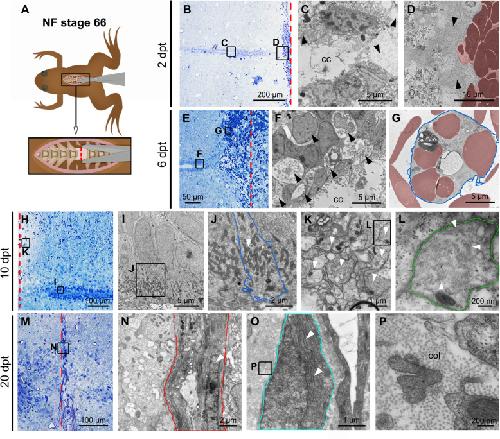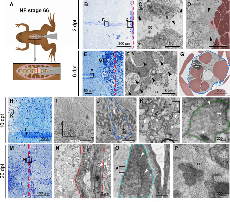 Fig. 2. Cellular response to injury in Non-Regenerative Stage. a Cartoon depicting the process of spinal cord injury in NF stage 66. b Semithin section at 2 dpt. c, d; f-g; i-l; n-p Correspond to ultrathin sections observed by transmission electron microscopy. c, d Different regions of the spinal cord at 2 dpt; c central canal (cc) next to the injured site (black arrowheads); d extracellular matrix and red blood cells (red shadow) in the injury site. e Semithin section at 6 dpt. f, g Different regions of the spinal cord at 6 dpt; f ependymal cells in the rostral stump (black arrowheads); g macrophage (blue line) engulfing red blood cells (red shadow) in the cc. h Semithin section of the caudal stump at 10 dpt. i-l Different regions of the spinal cord at 10 dpt; i ependymal cells near to the injured site; j mitochondria (white arrowhead) in the apical surface of ependymal cell (blue line) in contact with the cc; k glial cell processes next to the injured site (white arrowheads); l intermediate filaments (white arrowheads) in the glial process (green line). m Semithin section at 20 dpt. n-p Different regions of the spinal cord at 20 dpt; n ablation gap (red lines) filled with fibroblast-like cell (white arrowhead), and surrounded by extracellular matrix; o microglial-like cell (cyan line) with abundant rough endoplasmic reticulum (white arrowheads); p abundant Collagen (col) fibers (dots) in the injured site. The red dotted lines indicate the injured site (a, b, e, h, m)