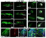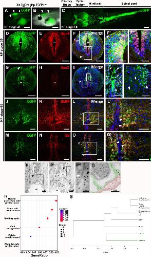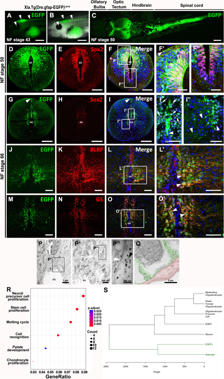 Fig. 4. Zebrafish regulatory regions of GFAP drive expression of EGFP in neural stem and progenitor cells, and astrocytes in Xenopus laevis spinal cord. A-C Lateral view of EGFP expression in the central nervous system at A, B NF-Stage 43, and C NF-Stage 50. A EGFP expression in the eye, brain and spinal cord (arrowheads). B EGFP/brightfield merge. C Dorsal view of EGFP expression in the optic tectum, hindbrain and spinal cord at NF stage 50. D-F Double staining against D EGFP and E Sox2. Panels F showed merge image, and Fâ, Fâ magnifications of the dorsal and ventral cells surrounding the central canal. G-Oâ Characterization of EGFP cells by double staining at NF stage 66. G-Iâ EGFP and Sox2; J-Lâ EGFP and Brain lipid-binding protein (BLBP); and M-Oâ EGFP and Glutamine synthase (GS). Nuclei are label in blue with Hoechst. P-Q Immunogold staining against EGFP at NF stage 50. P EGFP+ cell in contact with the central canal. Pâ Magnification of square in P. Expression of EGFP is visualized by the black dots of the gold staining. Pâ Magnification of square in Pâ. Gold staining (black arrowhead) in close apposition with filaments (white arrowhead). Q Endfeet from an EGFP+ cell (colored green) in close contact with blood vessel (colored red). R Gene ontology analysis of the RNAseq from EGFP+ cells revealed the stem cell/neural precursor cell identity of these cells. S Dendrogram of EGFP+ cells and EGFPâ cells showing the hierarchical clustering of EGFP+ cells with astrocytes and EGFPâ cells with neurons and oligodendrocytes. Scale bar: C, Fâ-Fâ³: 20âμm; A-B, D-F, Iâ-Iâ³, Lâ, Oâ: 50âμm; G-I, J-L, M-O: 200âμm