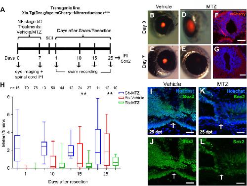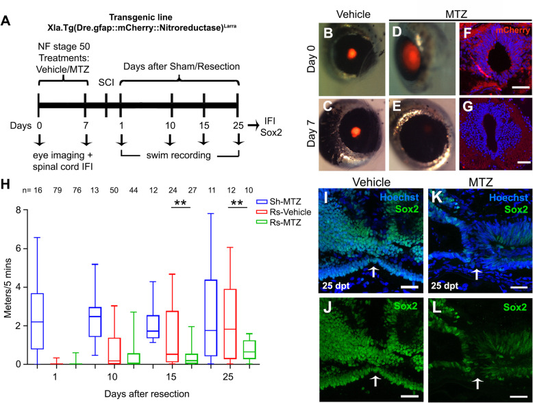 Fig. 7. Ablation of NSPCs blocks spinal cord regeneration. a Diagram of the treatment of zGFAP::mCherry-NTR transgenic animals with metronidazol (MTZ) or vehicle, followed by spinal cord resection, swimming recording, and histological analysis. b-e Eye imaging (b, d) before treatment, and 7âdays after incubation with c vehicle or e MTZ. f, g Spinal cord sections showing mCherry expression f before, and g 7âdays after MTZ treatment. h Graph of swimming at 1, 10, 15, 25 dpr in sham (Sh) operated animals treated with MTZ (Sh-MTZ, blue boxes), and resected (Rs) animals incubated with vehicle (Rs-Vehicle, red boxes) or MTZ (Rs-MTZ, green boxes). i-l Immunofluorescence against Sox2 (green) and nuclei stained with Hoechst of spinal cord sections obtained from animals at 30 dpr from the i, j Rs-vehicle, and k, l Rs-MTZ treated groups. Statistics in graph H: ANOVA-one way with Bonferroni post-test, ** pâ<â0.01, nâ=â4 independent biological replicates