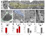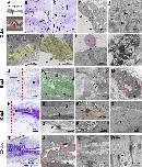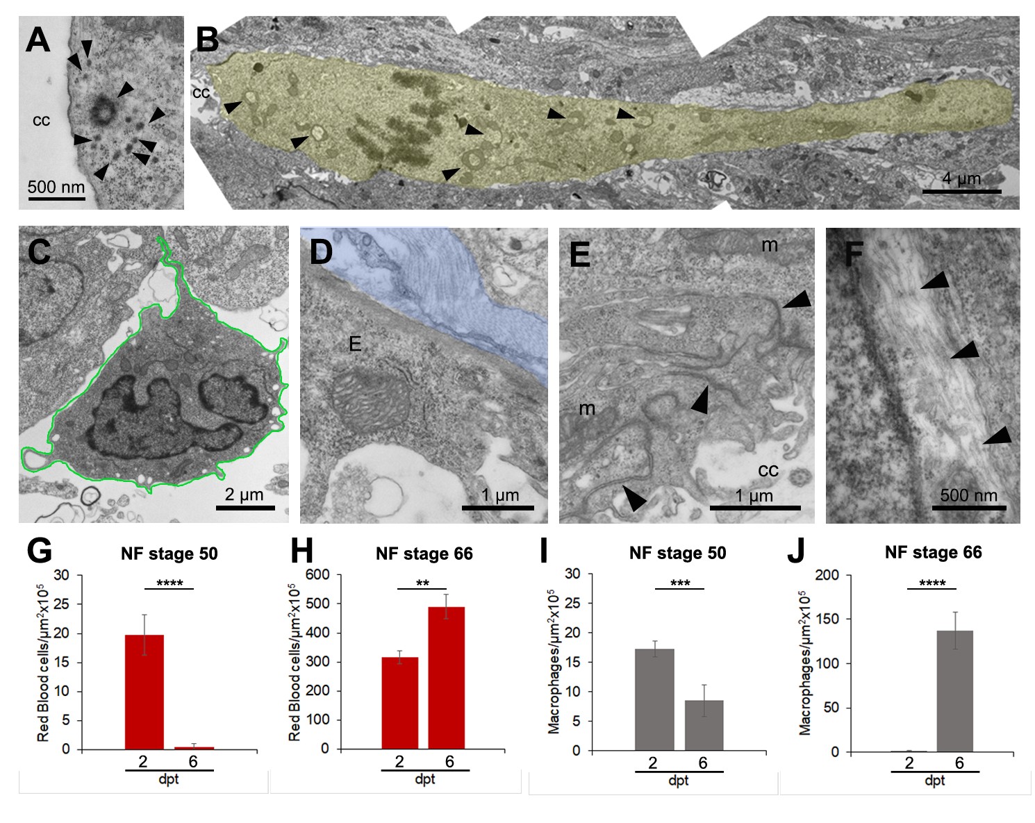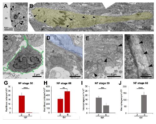 Figure S1. Cellular response to spinal cord injury in R- and NR-stages. (A) Centriolar satellite ultrastructure (arrowheads) in cells surrounding the rostral stump. (B) Radial projection of cells lining the central canal (yellow shadow). (C) Neutrophil in the injury site at 2 dpt in animals at NF stage 50. (C-E) Cells lining a rosette structure at 6 dpt are characterized by a (D) basal collagen lamina (blue shadow), (E) interdigitations and adherent junctions (arrowheads), and (F) intermediate filaments (arrowheads). Graphs of the number of red blood cells/μm2 Ãâ105 at (G) 2 and 6 dpt in NF stage 50, and (H) at 2 and 6 dpt in NF stage 66. Graphs of the number of macrophages/μm2 Ãâ105 at (I) 2 and 6 dpt in NF stage 50, and (J) at 2 and 6 dpt in NF stage 66. t-Test: ** pâ<â0,01; *** pâ<â0,001; **** pâ<â0,0001.