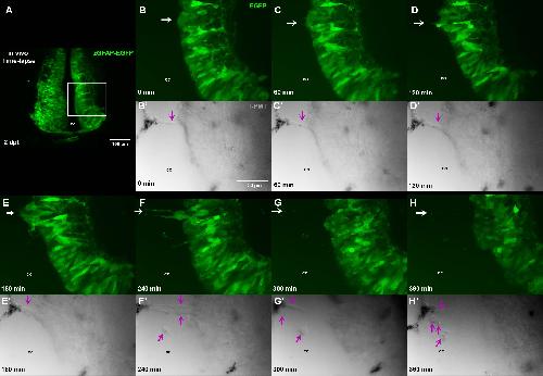 Figure S2. In vivo time-lapse imaging of cells being extruded into the central canal. (A) Rostral stump of the transected spinal cord from a zGFAP::EGFP transgenic animal at R-stage 2 dpt. A time-lapses during 7âh for EGFP and transmitted light (T-PMT) z-stack were capture at the following time points: (B-Bâ²) 0âmin; 60âmin (C-Câ²); 120âmin (D-Dâ²); 180âmin (E-Eâ); 240âmin (F-Fâ²); 300âmin (G-Gâ); 360âmin (H-Hâ²). White and purple arrows point to extrusion events from the cells lining the central canal.