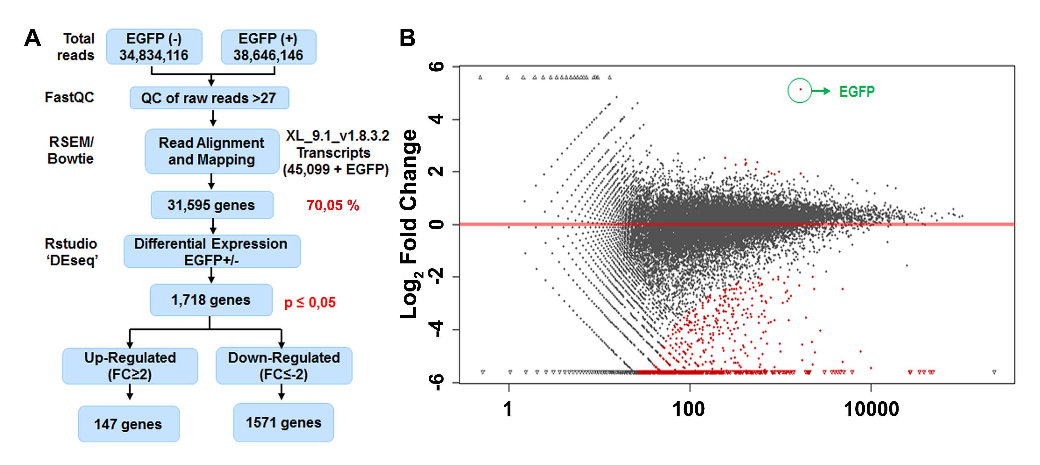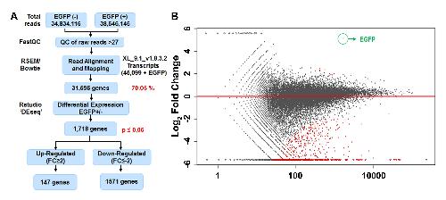 Figure S5. RNAseq of EGFP+ and EGFP− cells isolated from the transgenic line Xla.Tg(Dre.gfap:EGFP)Larra. (A) Flow chart of RNAseq bioinformatics analysis from EGFP+ and EGFP− cells. (B) Graph of the Log2 fold change of the differential gene expression between EGFP+ cells versus EGFP− cells after FACS and RNAseq. EGFP expression in EGFP+ cells (green) is highlighted.