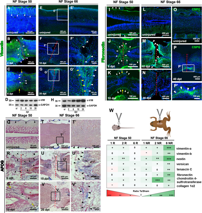 Fig. 3. Glial cell and extracellular matrix response to spinal cord injury in R-Stage and NR-Stage. a-c Immunostaining against vimentin in a uninjured, and at b 2 and c 6 dpt from animals at NF stage 50. d Western blot against Vimentin (Vim) and GAPDH of spinal cords samples obtained from uninjured (ui), and at 2, 6, 10 and 20 dpt in animals at NF stage 50. e-g Immunostaining against Vimentin in uninjured (e-eâ), and at (f, fâ) 10 and (g-gâ) 20 dpt from animals at NF stage 66. h Western blot against Vim and GAPDH of spinal cords samples obtained from uninjured (ui), and at 2, 6, 10 and 20 dpt in animals at NF stage 66. i-o Immunofluorescence against fibronectin in i uninjured, j 6 dpt, and k 10 dpt in NF stage 50; and l uninjured, m 10 dpt, and n 30 dpt in animals at NF stage 66. o-p Immunofluorescence against CSPG in o uninjured, and p-pâ at 40 dpt in NF stage 66. q-v AFOG staining shown Collagen (blue), cells (orange) and Fibrin (red) in q uninjured, and at r 6 and s 10 dpt in animals at NF stage 50, and in t-tâ uninjured, and at u-uâ 10 and v-vâ 20 dpt from animals at NF stage 66. w Analysis of gene expression change upon spinal cord injury comparing injured animals (Ts) with control sham (sham) surgery at 1, 2 and 6âdays after injury in NF stage 50 (1R, 2R and 6R), and NF stage 66 (1NR, 2 NR and 6 NR). Colored and crosses scale indicates the level of increase upon injury in green (+, ++, +++) and decrease in red (â, ââ, âââ), data obtained from a previous RNAseq analysis [49]. The red dotted lines (b, f, g, j, m, n, p, r, u, v) and yellow arrows (c, k, s) indicate the injured site. Nuclei stained with Hoechst in blue (a-c; e-g; i-p)