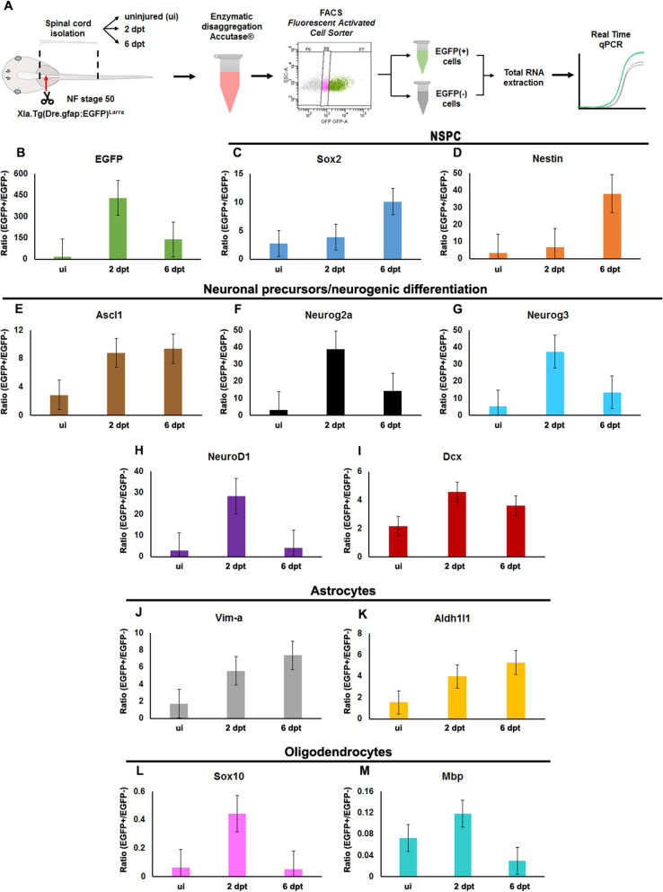 Fig. 6. Analysis of the differentiation of Neural Stem Progenitor Cells in response to spinal cord injury. a Diagram of the experimental procedure. b-m Graphs of the ratio in the mRNA levels for the indicated genes between the EGFP+ cells and EGFPâ cells in uninjured (ui), 2 and 6 dpt. b EGFP, c, d NSPCs markers: c sox2, d nestin. e-i neuronal precursor/neurogenic differentiation markers: e achaete-scute homolog 1 (ascl1), f neurogenin2a (neurog2a), g neurogenin3 (neurog3), h neurod1, i doublecortin (dcx). j, k Astrocytes markers: j vimentin-a (vim-a), k aldh1l1. l, m Oligodendrocytes markers: l sox10, m