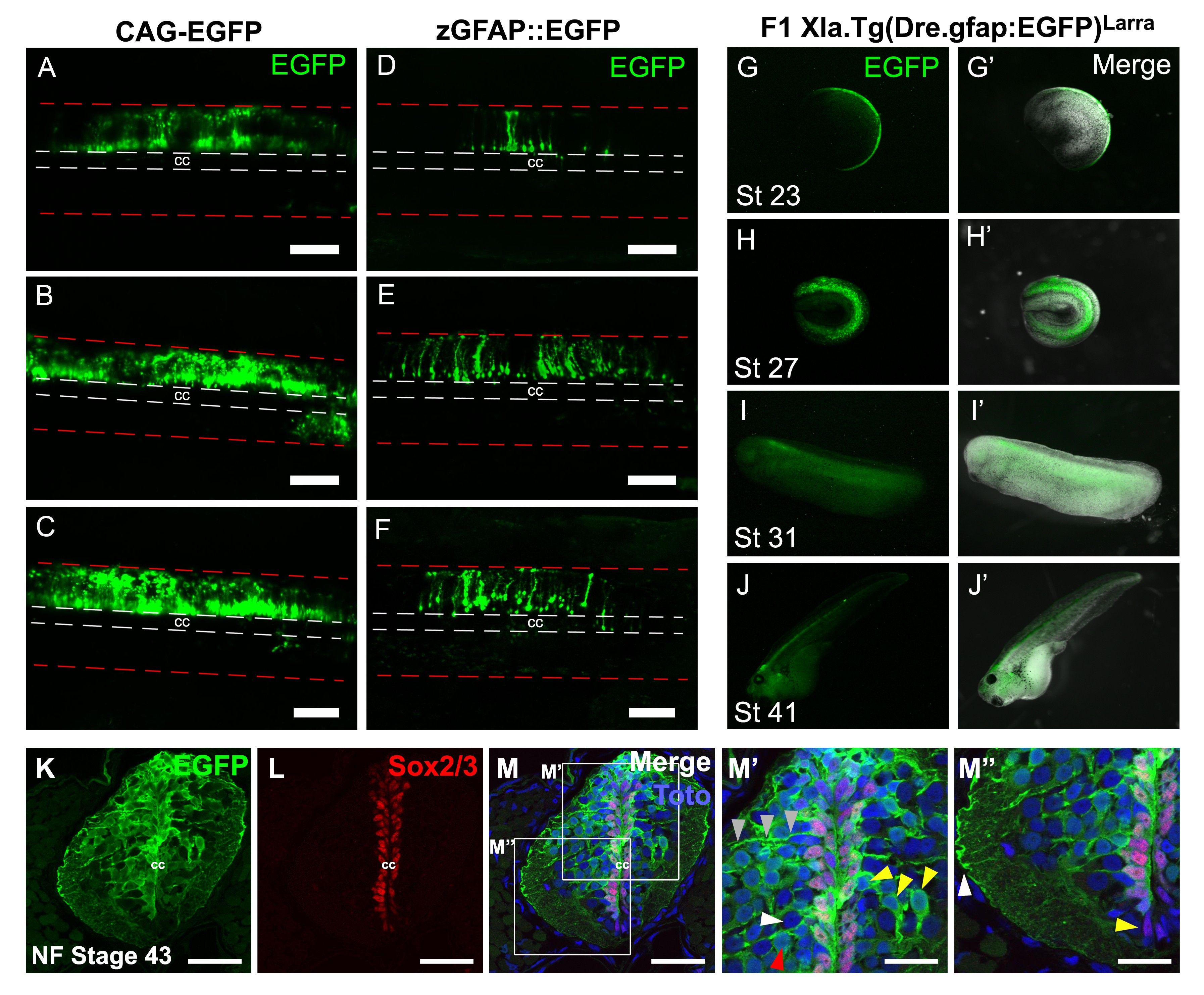 Figure S4. Transgenic line Xla.Tg(Dre.gfap:EGFP)Larra. (A-C) Three different animalsâ electroporated in the spinal cord with the CAG promoter driving the expression of EGFP in central canal cells. (D-F) Three different animals electroporated in the spinal cord with the zGFAP::EGFP construct driving specific expression in radial glial like cells in contact with the central canal. (G-J) Animals at different developmental stages of the transgenic line Xla.Tg(Dre.gfap:EGFP)Larra show in expression of EGFP in the neural tubeg at (G-Gâ) NF stage 23; (H-Hâ²) NF stage 27; (I-Iâ²) NF stage 31 and in the CNS at (J-Jâ) NF stage 41. (K-M) Double staining against (K) EGFP and (L) Sox2 in coronal section of the spinal cord at NF stage 43. Panels (M) showed merge image, and panels (Mâ, Mâ) are magnifications of the dorsal and ventral cells surrounding the central canal.