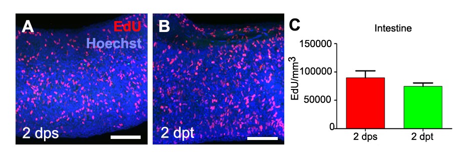 Figure S6. Analysis of EdU+ cells in the intestine. (A-B) Click-iT staining of EdU+ (red) of the intestine in (A) sham control animals (2 dps), and at (B) 2 dpt. Nuclei were stained with Hoechst (blue). (C) Graph of EdU+ cells per mm3 in the intestine. nâ=â3.