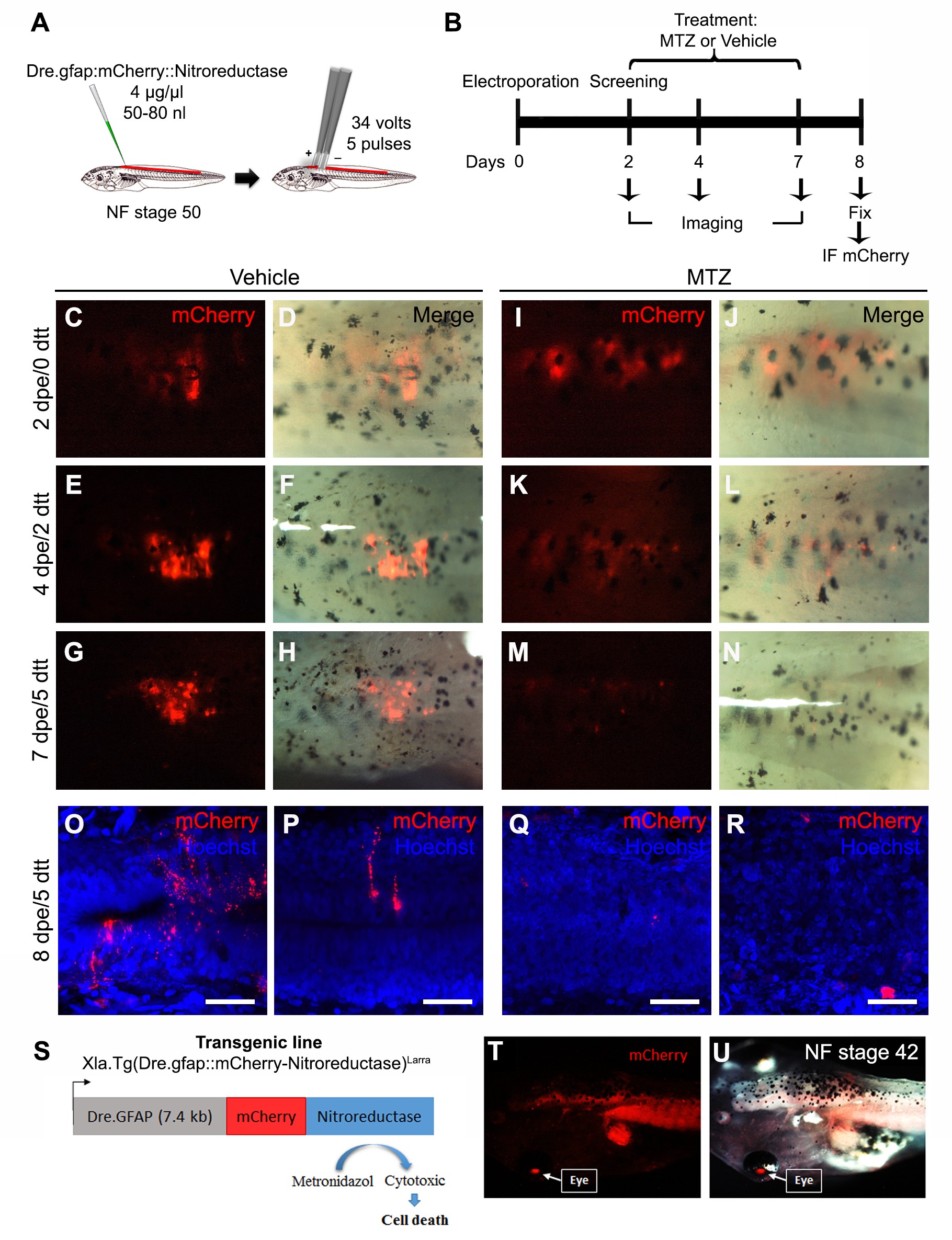 Figure S7. Transgenic line Xla.Tg(Dre.gfap:mCherry-Nitroreductase) allows selective cell ablation. (A) Diagram of injection and electroporation of the spinal cord at NF stage 50, indicating volume, concentration and parameters of electroporation. (B) Scheme of electroporation of the Dre.gfap:mCherry-Nitroreductase construct and treatment with vehicle or metronidazol (MTZ) at NF stage 50. (C-R) mCherry (red) expression in the spinal cord of animal electroporated at (C-D; I-J) 2âdays post electroporation (dpe), before treatment; (E-F; K-L) 4 dpe and 2âdays post treatment (dtt); (G-H; M-N) 7 dpe and 5 dtt, and (O- R) at 8 dpe and 6 dtt co-stained with Hoechst (blue). (S) The construct used to generate the transgenic line Xla.Tg(Dre.gfap:mCherry-Nitroreductase). (T, U) mCherry expression in the eye (arrow) and the brain of the transgenic animal at NF stage 42.