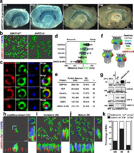 Fig. 1: Specific localization of ANKS1A to FOP-positive SDAs. a LWs (marked by dotted lines) with other forebrain tissues were subjected to X-gal staining. Scale bar, 500âμm. Cx cortex, CPu caudate putamen, ac anterior commissure. b The LWs were co-stained with ANKS1A, FOP, and CNTRL antibodies. The 3D SIM images were analyzed by the Imaris software. c 3DSIM micrographs of representative BBs. ANKS1A-VN was injected into the LV at E16.5 and subjected to in utero electroporation. The LWs at P4 were then co-stained for FOP and various BB markers with antibodies. Scale bar for b, c, 500ânm. d A median line and upper and lower quartile are presented in box and whisker plot of the axial distances of BB proteins from immature E1 cells. CEP164, nâ=â24; Centrin, nâ=â19; CNTRL, nâ=â14; ODF2, nâ=â15; ANKS1A-VN, nâ=â18. A green-shaded box marks a FOP-stained region brighter than 30% of the maximum intensity. e Table showing the radial distances of BB proteins from immature cells. The center of the FOP-positive ring image was used as a reference for the radial distances of BB proteins; n indicates the number of BBs used for statistical analysis. SD standard deviation. f Cartoon depiction of the BB proteins shown in d, e. g Whole-cell lysates (WCL) were prepared from six LWs at P4 and then the protein complexes were precipitated with the C-terminal specific antibody to detect the ANKS1A-associated proteins. hâj 3DSIM micrographs of BBs in E1 cells representing three different developmental stages. White arrowheads mark ANKS1A-VN present in FOP-stained SDAs. Scale bar for hâj, 500ânm. k Data shown in hâj were quantified with the total number of the double-positive FOP+CNTRL+ BBs set to 100%. Then the percentage of triple-positive ANKS1A+FOP+CNTRL+ BBs was calculated. Undifferentiated (UD), nâ=â67; immature (IM), nâ=â195; mature (M), nâ=â227 where n indicates the number of BBs analyzed.