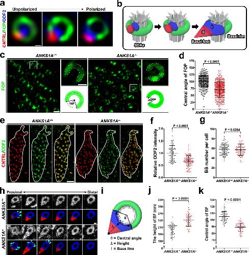 Fig. 2: ANKS1A loss results in partially impaired SDAs. a Representative 3DSIM images showing the gradual transition of SDAs from immature to the mature stage. Scale bar, 100ânm. b Cartoon depiction elucidating the dynamic change of SDAs from an unpolarized to a polarized state. c 3DSIM images were obtained from the anteriorâdorsal (AD) region of LWs, and the BB patches were then magnified for further analysis. Schematic beside each panel is for the Ã3.5 magnified white box and depicts the central angle of the FOP-negative region. Scale bar, 500ânm. d Data in c were quantified. Data are depicted as meanâ±âSD. Each point on the graph represents the central angle of the FOP-negative region. For the ANKS1A+/+ group, nâ=â356 BBs from 3 mice; for ANKS1Aâ/â, nâ=â412 BBs from 3 mice. e Experiments were performed as described in c, except that CNTRL and ODF antibodies were used. The boundary of each BB patch is outlined in white. Scale bar, 2âμm. f Data in e were quantified. Data are presented as meanâ±âSD. Each point on the graph represents the relative level of ODF2 intensity per BB patch. For the ANKS1A+/+ group, nâ=â68 cells from 2 mice; for ANKS1Aâ/â, nâ=â96 cells from 3 mice. g Number of BBs per cell was quantified based on their CNTRL staining, as illustrated in Supplementary Fig. 2c. Data represent meanâ±âSD. For the ANKS1A+/+ set, nâ=â81 cells from 3 mice; for ANKS1Aâ/â, nâ=â77 cells from 3 mice. h A ribbon of consecutive sections (50ânm) was placed on a one-hole grid and subsequently analyzed by TEM. Scale bar, 100ânm. i Schematic for clarifying the indices that represent the structural morphology of each BF. j, k The generated micrographs were aligned and used to measure the indices described in i. Data represent meanâ±âSD. For the ANKS1A+/+ group, nâ=â51 BBs; for ANKS1Aâ/â, nâ=â54 BBs.