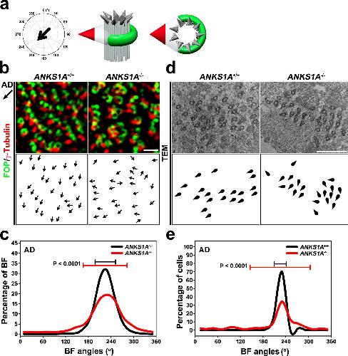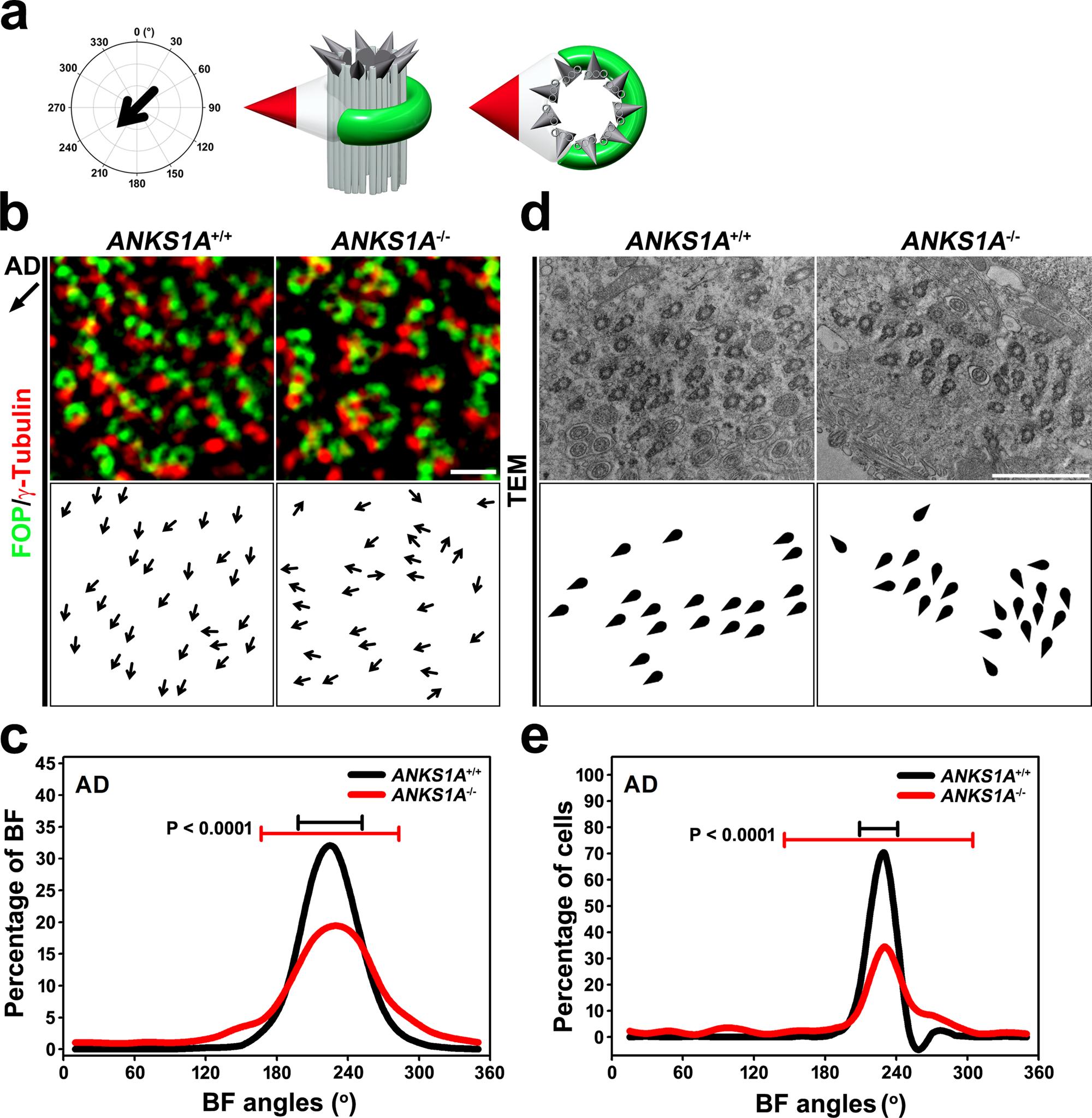 a Schematic depicting the flow of CSF (225°) in the AD region. Double staining for FOP (green, SDA marker) and γ-Tubulin (red, BF marker) to visualize rotational polarity. b Images of the AD region obtained by 3DSIM, and BBs magnified for rotational polarity analysis (top panels). Each black arrow points from the FOP staining toward the γ-Tubulin-positive dot, indicating the rotational polarity axis of each individual BF (bottom panels). Scale bar, 1âμm. c Histogram showing the distribution of the rotational vector angles. Error bars on the graph represent CSD. d En face electron micrographs from the apical surface of ANKS1A WT and KO samples (top panels). Schematics showing the BBs (circular) with BFs (triangular) appear in the bottom panels. Scale bar, 2âμm. e The TEM data shown in d were used to draw histograms. Error bars on the graphs represent CSD.