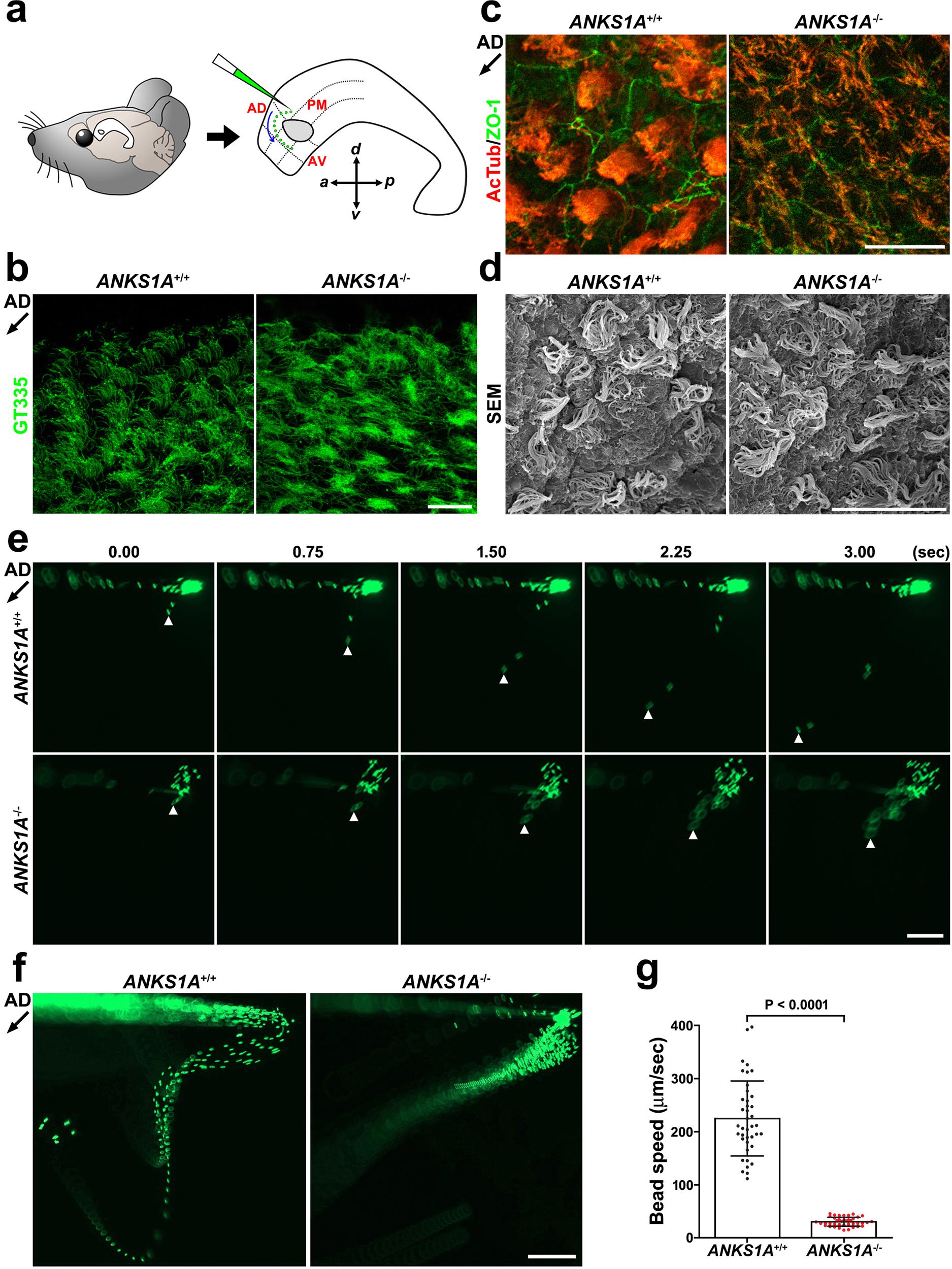 Fig. 3: ANKS1A loss results in uncoordinated beating of motile cilia. a Schematic of LWs showing three regions around the adhesion area (marked by a circle) or the movement of fluorescent beads (green) on a live LW. AD anteriorâdorsal, AV anteriorâventral, PM posteriorâmedial. b, c Whole-mount staining of LWs using GT335 (glutamylated tubulin) or AcTub (acetylated tubulin) antibodies at P20. The black arrow (~225°) indicates the direction of CSF flow in the AD region. The abnormal phenotype of KO ependymal cilia was observed from at least five different pairs of WT and KO littermates. Scale bar for b, c, 20âμm. d SEM analysis of LWs from littermates at P30. Scale bar, 20âμm. This result was reproducibly observed from at least three different pairs of WT and KO littermates. e High-speed video imaging analysis of the same fluorescent bead at different time points. f Thirty-five consecutive frames of Supplementary Movie 1 were merged into a single picture. Scale bar for e, f, 200âμm. g Data presented in d were used to calculate an average bead speed based on at least three independent experiments. Data represent meanâ±âS.D. Each point on the graph represents the speed of an individual bead.
