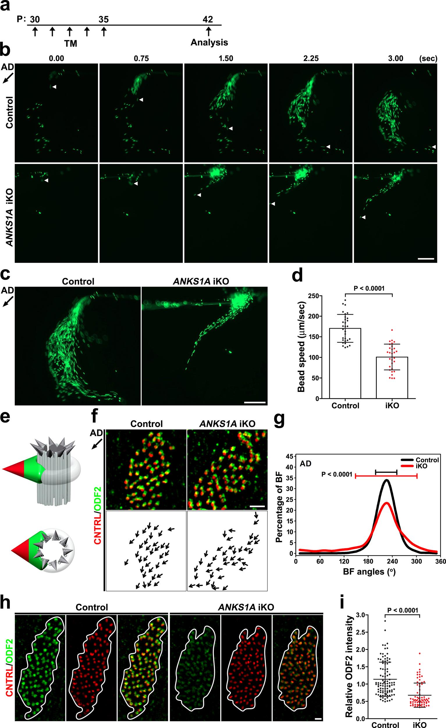 a Control and iKO mice were generated via five separate daily TM injections from P30 to P35. b The mice were sacrificed at P42 for live LW preparation, and the experiments were performed essentially as described in Fig. 3. c Thirty-five consecutive frames of Supplementary Movie 3 were merged into a single picture. Scale bar for b, c, 200âμm. d Data presented in b were used to calculate an average bead speed based on three independent experiments. Data represent meanâ±âSD. e Double staining for both ODF2 (green) and CNTRL (red) permitted the visualization of rotational polarity. f, g Experiments were performed as described in Fig. 4b, c. h, i Experiments were performed as described in Fig. 2e, f. Scale bar for f, h, 1âμm. Control set, nâ=â99 cells; ANKS1A iKO, nâ=â71 cells.