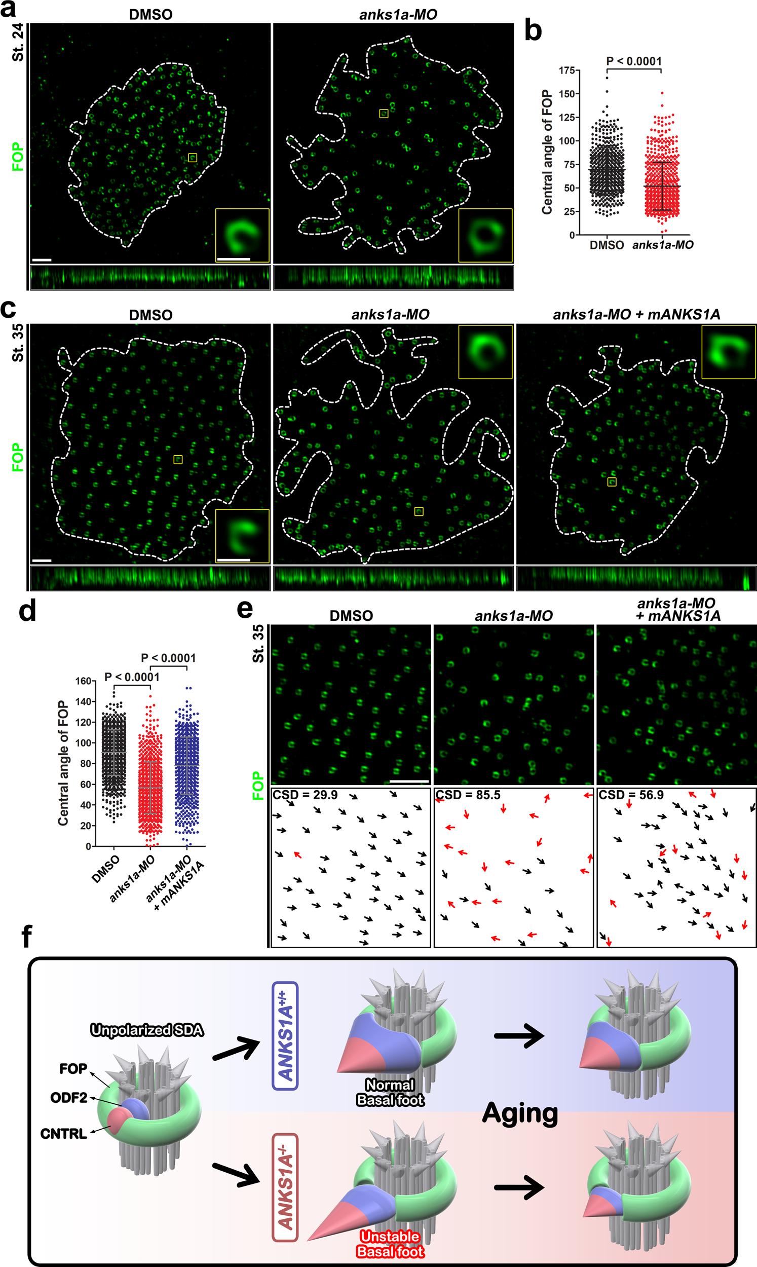 Fig. 8: ANKS1A function is highly conserved in Xenopus. a 3DSIM images were obtained from the epidermis of Xenopus embryos at stage 24. The BB patch outlined with white dotted lines was magnified for further analysis. A representative Fop image at Ã7 magnification of the region indicated by the yellow box. The central angle of the Fop-negative region is clearly visible. b The data in a were quantified. The data represent meanâ±âSD. Each point on the graph represents the central angle of a Fop-negative region. DMSO injection, nâ=â501 BBs from 3 embryos; anks1a-MO injection, nâ=â645 BBs from 3 embryos. c, d Experiments were performed essentially as described in a, b, except that the 3DSIM images were obtained from the epidermis of Xenopus embryos at stage 35. DMSO injection, nâ=â905 BBs from 5 embryos; anks1a-MO injection, nâ=â854 BBs from 5 embryos. anks1a-MO plus mouse ANKS1A-VN RNA injection, nâ=â726 BBs from 3 embryos. e Experiments were performed as described in Fig. 4b. Scale bar for a, c, e, 2âμm. f Model in which ANKS1A plays a pivotal role in the polarization of SDAs during the development of MCCs. In the absence of ANKS1A, the SDA BF adopts an unstable architecture and undergoes a gradual degeneration over the course of aging, causing the loss of the BBs and motile cilia.
