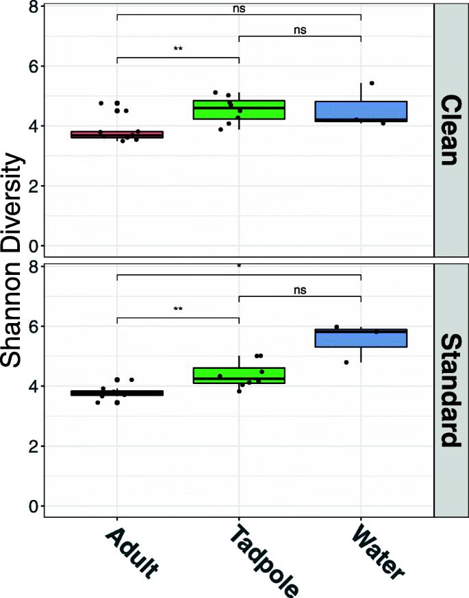 BACKGROUND: Historically the main source of laboratory Xenopus laevis was the environment. The increase in genetically altered animals and evolving governmental constraints around using wild-caught animals for research has led to the establishment of resource centres that supply animals and reagents worldwide, such as the European Xenopus Resource Centre. In the last decade, centres were encouraged to keep animals in a "low microbial load" or "clean" state, where embryos are surface sterilized before entering the housing system; instead of the conventional, "standard" conditions where frogs and embryos are kept without prior surface treatment. Despite Xenopus laevis having been kept in captivity for almost a century, surprisingly little is known about the frogs as a holobiont and how changing the microbiome may affect resistance to disease. This study examines how the different treatment conditions, "clean" and "standard" husbandry in recirculating housing, affects the skin microbiome of tadpoles and female adults. This is particularly important when considering the potential for poor welfare caused by a change in husbandry method as animals move from resource centres to smaller research colonies.