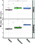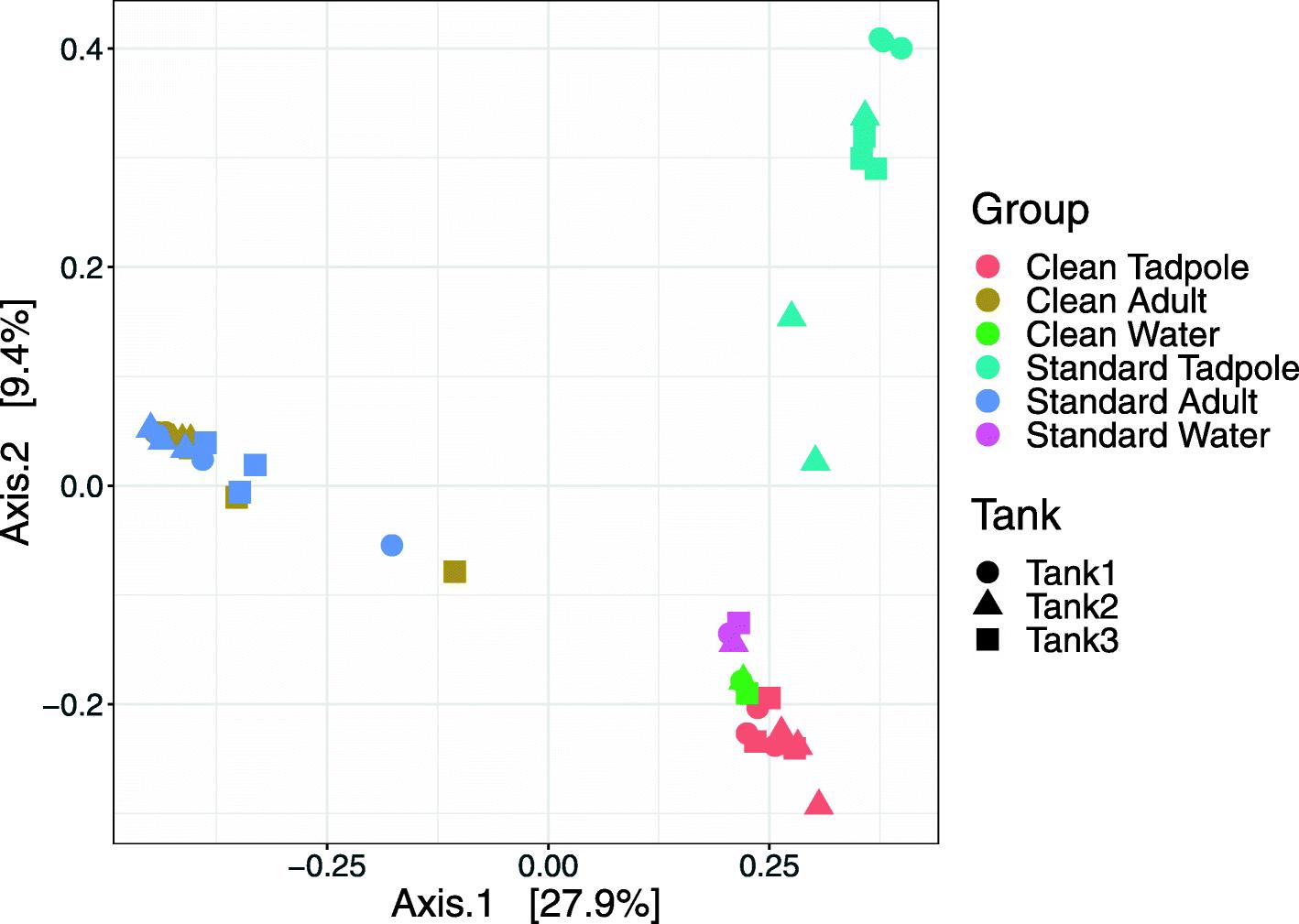 Fig 3. Principal coordinates analysis (PCoA) of all samples in the data set. Axis 1 and Axis 2 represent the coordinates of the greatest sources of orthogonal variation within the data and represent 27.9 and 9.4% of variation in the entire data set respectively. Whilst results from biological replicates and distinct tanks are generally consistent, Axis 1 represents the difference in diversity between the adult frogs as compared to both tadpoles and environmental water samples. Axis 2 shows close clustering between adults housed in standard and clean conditions, and tadpoles and their environmental water samples for clean conditions only. However, a significant change in diversity is seen for tadpoles from standard conditions, despite water samples from standard tanks showing similar profiles to those from clean tanks.