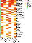 Fig. 6. Heatmap showing the top 50 species identified across the data set. OTU counts from biological replicates amongst the different replicate tanks were combined to give a single count, which was normalised so that all samples had the same total. Cells are coloured based on the percentage of the total OTU count (on a log10 scale), with more abundant OTUs shown in red
