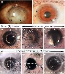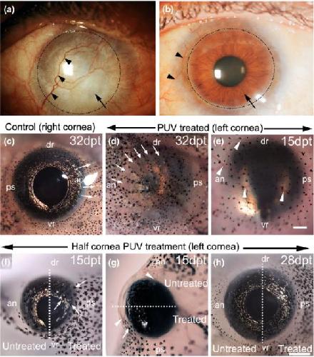FIGURE 1 Limbal stem sell deficiency and stem cell transplantation in humans, and stem cell deficiency and corneal restoration in Xenopus.(a) Example of a human cornea with total limbal stem cell deficiency after receiving a chemical burn with involvement of the corneal stroma.Corneal opacification (black arrows) and neovascularization (black arrowheads) is apparent. (b) Example of another patient who received acultivated autologous limbal stem-cell graft, and penetrating keratoplasty (in some cases, this secondary corneal transplant from an allogeniccornea is necessary for improving visual acuity), showing successful restoration of a transparent corneal epithelium (black arrow). Vascularizationis now restricted to the conjunctiva (black arrowheads). Dotted black circle outlines the cornea region. (câe) PUV treatment model of stem celldeficiency in Xenopus recapitulates the hallmarks of human limbal stem cell deficiency. (c) Control frog cornea depicting normal transparentmorphology. The cornea is free of vasculature, pigment cells, and the lateral line organs (white arrows) are restricted to the surrounding skin.(d) PUV treated cornea at 32 days post treatment (dpt), depicting the loss of transparency. The cornea is covered with epidermal tissue similar tothat surrounding the eye. Skin cells, including pigment cells, and the lateral line organs (white arrows), have invaded the corneal region. Note linesof melanophores between the lateral line organs. (e) Younger PUV treated case at 15dpt, depicting vascularization with multiple blood vesselspassing into the cornea (white arrowheads). (fâh) PUV treatment localized to one half of the Xenopus cornea is eventually restored. (f) At 15 dayspost PUV treatment, the treated half shows opacity and increased pigmentation (white arrows), whereas the untreated half is devoid of pigmentcells and remains transparent. (g) Dorsal view of the specimen shown in (f) shows neovascularization (white arrowheads), and increasedpigmentation (white arrows). (h) At 28 days post PUV treatment, the treated half of the cornea has been restored. It is now transparent and freefrom pigment cells. an, anterior side; dr, dorsal side; ps, posterior side; vr, ventral side. Scale bar in (e) equals 665 îm for (c,d), and 200 îm for (e).Scale bar in (h) equals 500 îm for (fâh). Image in (a) is from Sacchetti et al. (2018), Limbal Stem Cell Transplantation: Clinical Results, Limits, andPerspectives, Copyright © (2018), open access article distributed under the Creative Commons Attribution 4.0 International License (http://creativecommons.org/licenses/by/4.0/). Image in (b) is from Paolo, R., Matuska, S., Paganoni, G., et al. Limbal stem-cell therapy and long-termcorneal regeneration, The New England Journal of Medicine, 363(2), 147â155. Copyright © (2010) Massachusetts Medical Society, Reprinted withpermission from Massachusetts Medical Society. Images in (c,eâh) are reprinted from Adil, M. T., Simons, C. M., Sonam, S., Henry, J. J.Understanding cornea homeostasis and wound healing using a novel model of stem cell deficiency in Xenopus, Experimental Eye Research, 187,107767. Copyright (2019), with permission from Elsevier