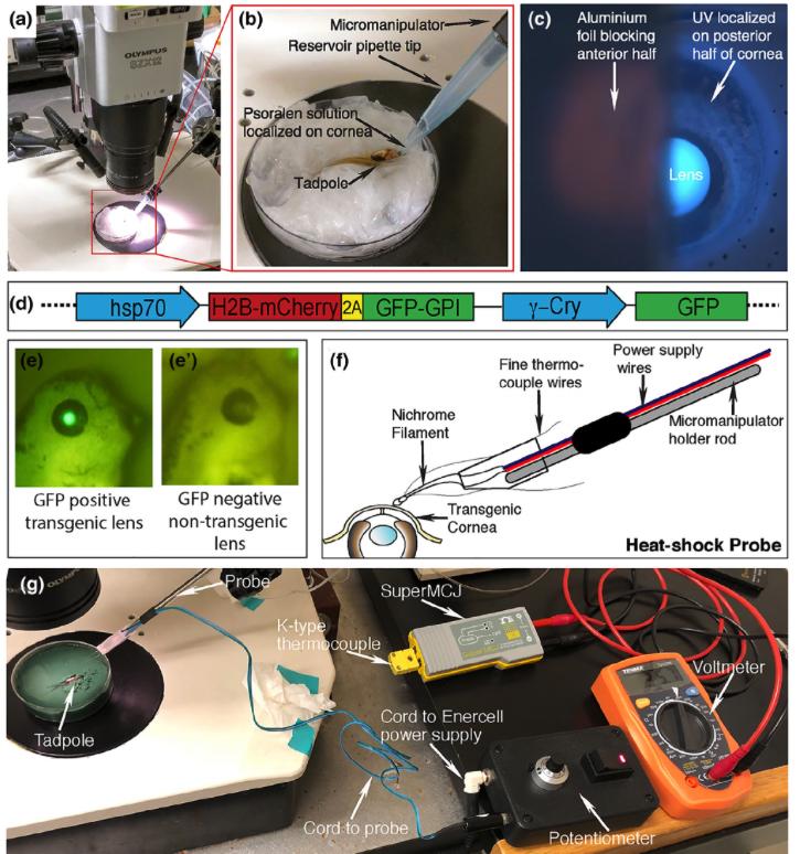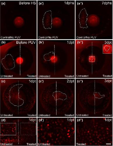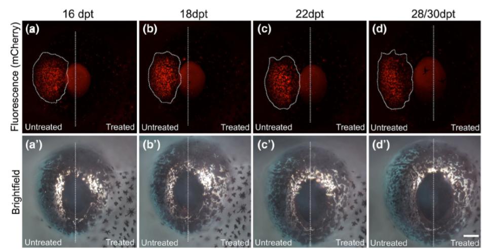 FIGURE 8 Response of labeled cells to increased UV exposure during localized PUV treatment in Xenopus.(aâd) Typical example showingnuclei labeled at 15dpt in the untreated half of the cornea in specimens that received PUV treatment in the other half. (see data in Appendix 3g).Representative mCherry images are shown at the time points indicated after PUV treatment. Labeled nuclei show minimal movement from 16 to28/30dpt. (a0âd0) Corresponding brightfield images of the specimen in (aâd) at respective time points. A similar response was seen as compared tocases show in Figure 7e above. Dotted white vertical line passes through the center of the cornea. White dotted enclosed area indicates clusterof heat-shock activated H2B-mCherry expressing nuclei. dpt, days post treatment. Scale in (d0) equals 200 îm
