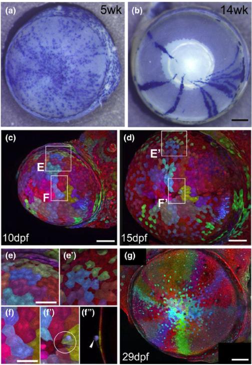 FIGURE 3 Lineage tracing in mice and zebrafish corneas. (a,b) Lineage tracing in CAGG driven LacZ mice. Eyes were stained for β-gal activityafter a 5 week (wk) chase period. (a) shows small β-gal positive patches throughout the cornea and conjunctiva. (b) After a 14 week chase periodstripes extend radially toward the center of the cornea. (câg) Long-term clonal analyses in the zebrafish cornea expressing the âZebrabowâconstruct. Recombination was induced at 6â12 hr post fertilization for expression of different fluorescent proteins, and images taken at the timepoints indicated. (c,d) Corneal clones at 10 and 15 days post fertilization (dpf). (e,e0) High magnification views near the periphery of the corneataken from (c) and (d), respectively. Labeled cornea clones near the periphery become scattered and interspersed by smaller cell clones. (f,f0) Highmagnification views near the center of the cornea taken from (c) and (d), respectively. Rosette-like structures are seen in the central cornea(compare f with f0, circle marks a rosette). (f00) Optical cross-section at the center of the rosette shown in (f0). A single blue cell has been extrudedfrom the corneal surface (arrowhead). (g) Example of well-established wedge-shaped clones in an older juvenile fish. Scale bar in (a) equals 0.5 mmfor (a,b). Scale bars equal 100 îm in (c,d); 50 îm in (e,e0,f,f0,f00); 200 îm in (g). Images in (a,b) are from Dora et al. (2015), Lineage tracing in theadult mouse corneal epithelium supports the limbal epithelial stem cell hypothesis with intermittent periods of stem cell quiescence, Copyright ©2015, Dora et al., published by Elsevier, open access article distributed under the Creative Commons Attribution License 4.0 (http://creativecommons.org/licenses/by/4.0/). Images in (câg) are from Pan et al. (2013), and reproduced with permission from Development, Copyright© (2013), The Company of Biologists Ltd