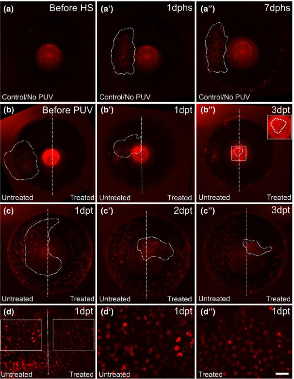 FIGURE 6 Response of cornea cells during homeostasis and following localized PUV treatment in Xenopus.(aâa00) Control transgenic corneasthat did not receive PUV treatment, showing unlabeled cornea immediately before localized heat-shock (a), and corneas showing labeled nuclei at1 day (a0) and 7 days post heat-shock (a00). Over time, the labeled cluster of cells has become somewhat elongated. (bâb00) Corneas showing theinitial location of heat-shock labeled nuclei (b), and their rapid displacement toward the treated side of the cornea 1 day after localized PUVtreatment (b0). These labeled nuclei presumably divide quickly to dilute the fluorescence by 3dpt as fewer labeled nuclei can be seen (b00, andinset). (câc00) Another example showing displacement of heat-shock labeled nuclei from 1 to 3dpt. This particular specimen has extensive leakybackground expression from the hsp70 promoter in deeper cells of the iris/retina. Nevertheless, the cluster of heat-shock labeled cornea cells isdistinctly detectable, and has become displaced to the PUV treated side by 3dpt. Note that the dotted area gets smaller as the labeled nuclei aredisplaced and undergo mitosis. (d) Excised flat mount of a cornea that received PUV treatment on one half and heat-shock to label the nuclei incells on the untreated half. Labeled nuclei are present in both halves at 1dpt. (d0,d00) Magnified images of the boxed areas in (d). Dotted whitevertical line passes through the center of the cornea. White dotted enclosed area indicates heat-shock activated H2B-mCherry expressing nuclei.dphs, days post heat-shock; dpt, days post treatment; HS, heat-shock; PUV, psoralen UV treatment. Number of cases examined (N) = 6 for controlcases; and for PUV treated cases, N = 19 for 1dpt, 9 for 2dpt, 10 for 3dpt. Scale bar in (d00) equals 50 um for (d0,d00), 100 um for (d), and 200 îmfor (aâc00