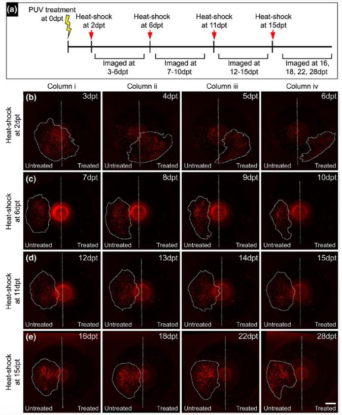 FIGURE 7 Response of cornea cells at later time points after localized PUV treatment in Xenopus. (a) Schematic of experimental outline.Specimens received PUV treatment on one half of the cornea. At 2, 6, 11, and 15dpt, specimens received heat-shock to a cluster of cells on theuntreated half of the corneas, and representative mCherry images are shown at various time points, as indicated (N = 11 for time points incolumns iâiii; N greater than or equal to 8 for time points in column iv). (b) Corneas showing rapid displacement of nuclei that were labeledinitially at 2dpt. (c,d,e) Corneas showing minimal movement in the nuclei that were labeled at 6, 11, and 15dpt, respectively. Dotted white verticalline passes through the center of the cornea. White dotted enclosed area indicate clusters of heat-shock activated H2B-mCherry expressingnuclei. dpt, days post treatment; PUV, psoralen UV treatment. Scale in (e column iv) equals 200 um