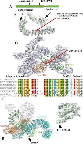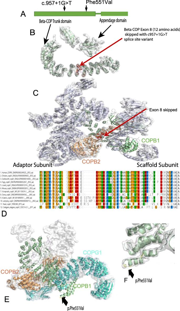 Fig. 3 Structure and conservation of COPB1 protein, and structural effect of missense variants. a Simple schematic diagram of COPB1 (β-COP) structure showing two main structural domains; trunk domain and appendage domain, and relative location of the c.957+1G>T and p.Phe551Val variants located towards the N terminal of the trunk domain. b COPB1 (β-COP) structure with the location of the 12 amino acids (in red) which are deleted due to exon 8 skipping caused by c957+1G>T. c COPB1 (β-COP) structure in context of COPI complex. Note exon 8 (red) makes up an important link between the scaffold and adaptor subcomplexes. d Alignment of COPB1 amino acid sequence from H. sapiens to yeast showing very high conservation of Phe551 across all species tested. e 3D structural modelling of COPB1 in complex with COPB2 and COPG1 showing the location of Phe551 near the site of interaction with COPG1. f Higher resolution image showing the location of Phe551Val mutation in a turn in the trunk domain