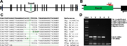 Fig. 4 Targeted CRISPR/Cas9 disruption of copb1 exon 8 generates a range of insertion-deletion changes in vivo. Xenopus tropicalis copb1 has 21 exons, including an untranslated first exon (a). CRISPR/Cas9 directed indel formation disrupting X. tropicalis exon 8 using 2 sgRNAs (red: sgRNA3 and sgRNA4 (b)) results in homozygous frameshift and splice changes akin to those identified within the patient subpopulation. Genotyping analysis of X. tropicalis crispants details the range of indels across three groups of 10 pooled tadpoles (NF41) injected with sgRNA3 following PCR amplification and Sanger sequencing of subclones (c). The 41-bp deletion observed in gDNA subclones extends into the intronic region and is proposed to induce exon 8 skipping in crispant X. tropicalis tadpoles. Total RNA was obtained from 4 groups (un-injected control (1), copb1 sgRNA 3 crispant set 1 (2) and copb1 sgRNA 3 crispant set 2 (3), injected control (4)) of 10 pooled individuals as outlined in Guille 1999 [51] and cDNA synthesised using Primer Designâs Reverse Transcription Premix 2. Amplification across the copb1 region of interest revealed a band at 382âbp (exons: 7, 8 and 9) and an additional band in crispants at 262âbp (exons: 7 and 9, Additional file 1: Fig. S1D)