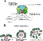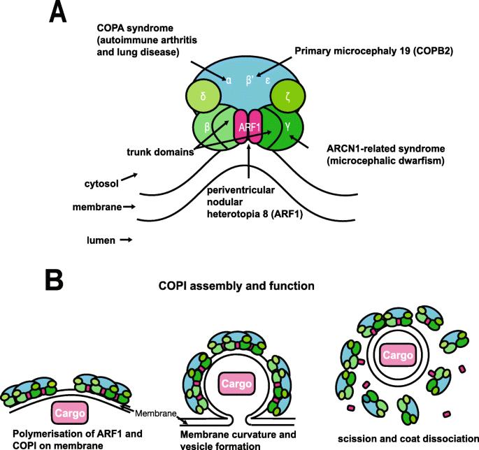 Fig. 1 Structure and function of the COP1 complex. a COPI consists of a scaffold âB-subcomplexâ (blue) and an adaptor âF-subcomplexâ (green). When GTP-bound, two ARF1 small GTPase molecules associate with the membrane and bind COPI via the β-COP and γ-COP subunits. A number of subunits of this complex have been implicated in human disease as shown. b COPI complexes and their ARF1 molecules associate into triads. Cargo, such as ER-resident proteins which need to be returned from the Golgi, are selected by binding directly with COPI subunits or indirectly through transmembrane receptors which in turn bind with COPI. COPI polymerises on the membrane enabling its deformation/curvature, and eventually budding and scission of the transport vesicle. When released, the vesicleâs coat is shed and ARF1 and COPI dissociate. Adapted from Nickel et al. [12]