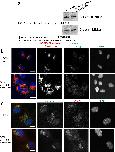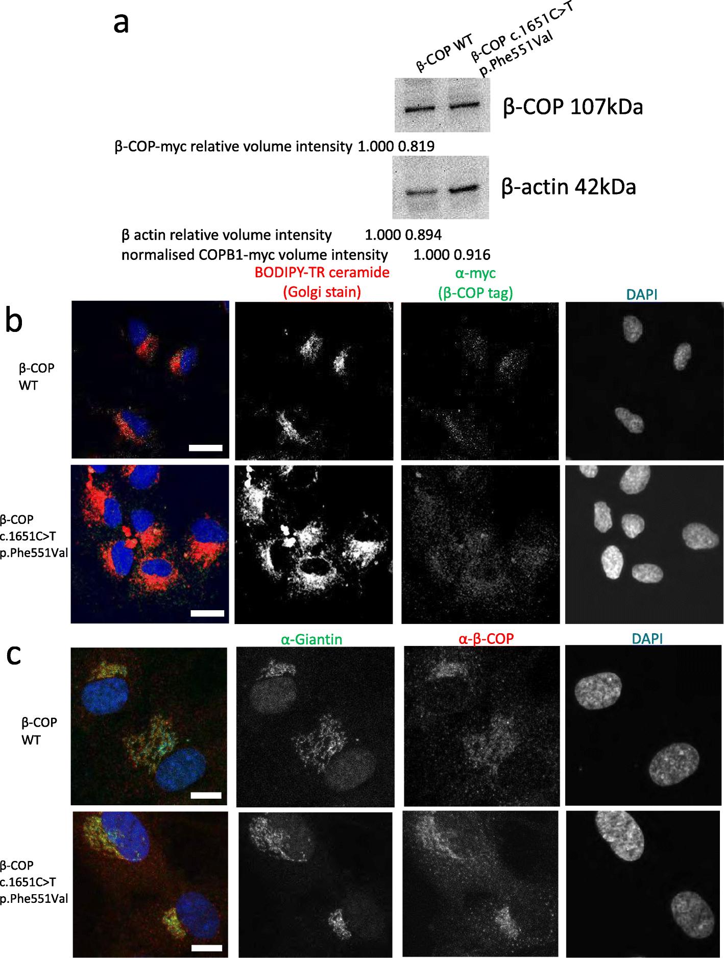 Fig. 6 Effect of expression of COPB1 mutation on in vitro localisation and stability of β-COP protein. a Western blot image of protein extracts from HEK293 cells transfected with wild-type, and c.1651T>G (COPB1 tagged with c-myc, immunoblotted with c-myc antibody to detect COPB1, and with beta-actin antibody as loading control). c.1651T>G shows a slightly reduced normalised level. b Immunofluorescence images of hTERT-RPE1 cells nucleofected with wild-type COPB1 (top row), and COPB1 c.1651T>G p. p.Phe551Val (lower row) tagged with c-myc. Cells were stained with Golgi stain Bodipy-TR-ceramide (red), nuclear stain DAPI (blue) and immunostained with anti-myc (green). Mutant expression shows more diffuse β-COP staining throughout the Golgi and outside the Golgi in the wider cytoplasm. Scale barâ=â5âμm. c Immunofluorescence images of hTERT-RPE1 cells nucleofected with wild-type COPB1 (top row), and COPB1 c.1651T>G p. p.Phe551Val (lower row) tagged with c-myc. Cells were stained with nuclear stain DAPI (blue) and immunostained with an antibody to resident Golgi protein giantin (green) and anti-β-COP (red). This clarified that wild-type β-COP tended to localise to the edges of the Golgi stacks, whereas mutant β-COP was localised throughout the Golgi. Scale barâ=â10âμm