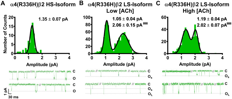 Fig 1. Unitary amplitudes associated with human HS- and LS-isoform α4(R336H)β2-nAChR expressed in Xenopus laevis oocytes.Example single-channel ACh evoked response traces are shown below panels (A), (B), and (C), exhibiting a typical mixture of individual openings and short bursts of activity, interspersed with longer periods of inactivity. (A) Amplitudes of HS-isoform α4(R336H)β2-nAChR open events evoked by 1.3 μM ACh are characterized as a single population. (B and C) LS-isoform α4(R336H)β2-nAChR single-channel openings appeared to exhibit two distinct amplitudes, whether they were evoked in the presence of either a low ACh concentration (0.7 μM; Panel B) or a high ACh concentration (30 μM; Panel C). This finding was confirmed by two-way ANOVA, using ACh concentration and apparent amplitude class (small opening (OS) or large opening (OL)) as factors. A main effect of amplitude class was observed, confirming that amplitudes of OS and OL are distinctly different from each other (F1,22 = 144.7, ɫɫɫɫP < 0.0001). In contrast, no main effect of ACh concentration on open amplitude was observed (F1,22 = 0.04, P = 0.53), nor was there a significant interaction between the two factors (interaction ACh concentration x amplitude size F1,22 = 0.25, P = 0.25). Accordingly, the amplitudes of OS and large opening OL were not significantly altered by changes in the concentration of ACh applied. Amplitude histograms represent events collected across multiple individual single-channel patch recordings, for each illustrated combination of receptor construct and ACh concentration. Values are given as mean ± S.E.M., and were collected from 5–8 patches across a minimum of three separate experiments. |