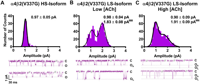 Fig 2. Unitary amplitudes associated with human HS- and LS-isoform α4β2(V337G)-nAChR expressed in Xenopus laevis oocytes.As in Fig 1, example single-channel ACh evoked response traces are shown below panels (A), (B), and (C), which display a mixture of individual openings and short bursts of activity, which are interspersed with longer periods of inactivity. (A) HS-isoform α4β2(V337G)-nAChR stimulated with 1.3 μM ACh produced single-channel openings with a single characteristic amplitude. (A) Amplitudes of HS-isoform α4(R336H)β2-nAChR open events evoked by 1.3 μM ACh are characterized as a single population. (B and C) LS-isoform α4β2(V337G)-nAChR single-channel openings appeared to exhibit two distinct amplitudes, whether they were evoked in the presence of either a low ACh concentration (0.7 μM; Panel B) or a high ACh concentration (30 μM; Panel C). Similar to the findings for LS-isoform α4(R336H)β2-nAChR, this was confirmed by two-way ANOVA. A main effect of amplitude class was again observed, confirming that amplitudes of small openings (OS) and large openings (OL) are distinctly different from each other (F1,20 = 124.2, ɫɫɫɫP < 0.0001). In a further point of similarity with LS-isoform α4(R336H)β2-nAChR, the amplitudes of OS and OL of LS-isoform α4β2(V337G)-nAChR were not significantly altered by changes of applied ACh concentration (F1,22 = 0.04, P = 0.53), nor was there a significant interaction between the two factors (interaction ACh concentration x amplitude size F1,22 = 0.25, P = 0.25). Amplitude histograms represent events collected across multiple individual single-channel patch recordings, for each illustrated combination of receptor construct and ACh concentration. Values are given as mean ± S.E.M, and were collected from 5–7 patches across a minimum of three separate experiments. |