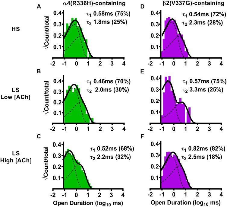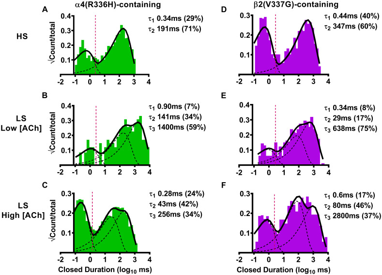 Fig 3. Closed-dwell time durations between single-channel openings of human HS- or LS-isoform α4(R336H)β2- or α4β2(V337G)-nAChR isoforms expressed in Xenopus laevis oocytes.(A) HS-isoform α4(R336H)β2-nAChR were stimulated with ACh (1.3 μM) and the resulting closed-dwell time durations between openings were best described with a pair of time constants. (B) When LS-isoform α4(R336H)β2-nAChR were stimulated at a low ACh concentration (0.7 μM), closed durations between openings were best described with three time constants. (C) The number of time constants required to best fit closed time distributions did not change as LS-isoform α4(R336H)β2-nAChR were stimulated at a higher ACh concentration (30 μM). (D) HS-isoform α4β2(V337G)-nAChR were stimulated with ACh (1.3 μM) and the resulting closed durations between openings were best described with a pair of time constants. (E) When LS-isoform α4β2(V337G)-nAChR were stimulated with a low ACh concentration (0.7 μM), closed durations between openings were best described with three time constants. (F) Increasing the ACh concentration to 30 μM did not change the number of time constants required to best fit closed duration distributions of LS-isoform α4β2(V337G)-nAChR. Closed-dwell duration histograms are representative examples collected from individual single-channel patch recordings. Individual τ values and percentage of total events corresponding to each closed duration (in parentheses) from these example patch recordings have been inserted into each panel to facilitate interpretation. Data were collected from 5–8 individual patches, across at least three separate experiments. Mean values of each property calculated from group data are summarized in Table 3, as mean ± SEM, together with any statistical analyses applied. |