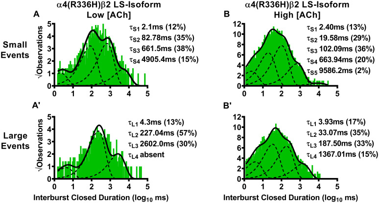 Fig 5. Closed-dwell time durations between burst activity of human LS-isoform α4(R336H)β2-nAChR.Closed-dwell time durations between bursts of activity (interburst durations) were measured for LS-isoform α4(R336H)β2-nAChR expressed in Xenopus laevis oocytes. Closed durations between bursts of either small (A) or large amplitude (A’) events evoked from LS-isoform α4(R336H)β2-nAChR at a low ACh concentration (0.7 μM) were best fit with four or three τ values, respectively. Increasing the ACh concentration to 30 μM resulted in LS-isoform α4(R336H)β2-nAChR closed state intervals between bursts of small (B) or large amplitude (B’) events that were best fit with five and four time constants, respectively. Interburst duration histograms are shown for pooled data from all recordings, which result from collection of data from 5 or 8 individual patches, across at least three separate experiments. The calculated τ values are summarized as mean ± SEM in Table 5, together with the statistical analyses applied. |