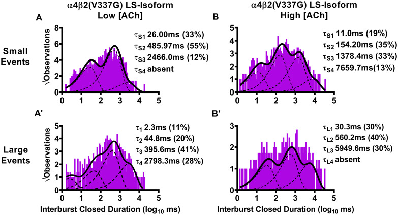 Fig 6. Closed-dwell time durations between burst activity of human LS-isoform α4β2(V337G)-nAChR.Closed-dwell time durations between bursts of activity (interburst closed durations) were measured for LS-isoform α4β2(V337G)-nAChR expressed in Xenopus laevis oocytes. Closed durations between bursts of either small (A) or large amplitude (A’) events evoked from LS-isoform α4β2(V337G)-nAChR at a low ACh concentration (0.7 μM) were best fit with either three or four τ values, respectively. Increasing the ACh concentration to 30 μM resulted in closed state intervals between bursts of LS-isoform α4β2(V337G)-nAChR small (B) or large amplitude (B’) events that were best fit with four and three time constants, respectively. Interburst closed duration histograms are shown for pooled data from all recordings, which result from collection of data from 5 or 7 individual patches, across at least three separate experiments. The calculated τ values are summarized as mean ± SEM in Table 5, together with the statistical analyses applied. |