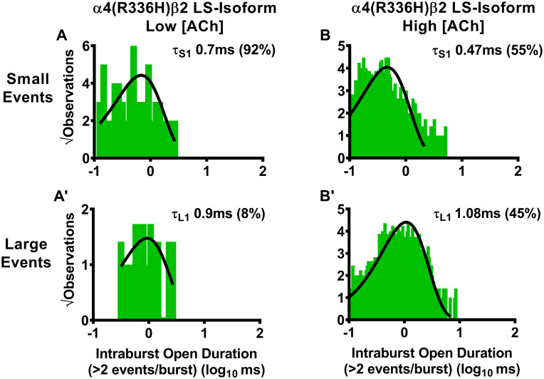 Fig 7. Durations of individual openings within bursts of small or large amplitude openings of human LS-isoform α4(R336H)β2-nAChR.LS-isoform α4(R336H)β2-nAChR were expressed in Xenopus laevis oocytes and durations of individual openings within bursts of activity (intraburst openings) were measured. For LS-isoform α4(R336H)β2-nAChR stimulated with a low ACh concentration (0.7 μM), bursts of either small (A) or large amplitude (A’) events were seen. Openings within bursts of small amplitude events were best characterized using a single time constant, as were openings within bursts of large amplitude events. When the ACh concentration was increased to 30 μM, durations of individual openings of LS-isoform α4(R336H)β2-nAChR within small (B) or large amplitude (B’) bursts each remained associated with single time constants. Histogram panels each show pooled data, which were collected from 5 or 8 individual patches, across at least three separate experiments. The calculated τ values are summarized as mean ± SEM in Table 6, together with the statistical analyses applied. |