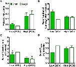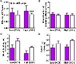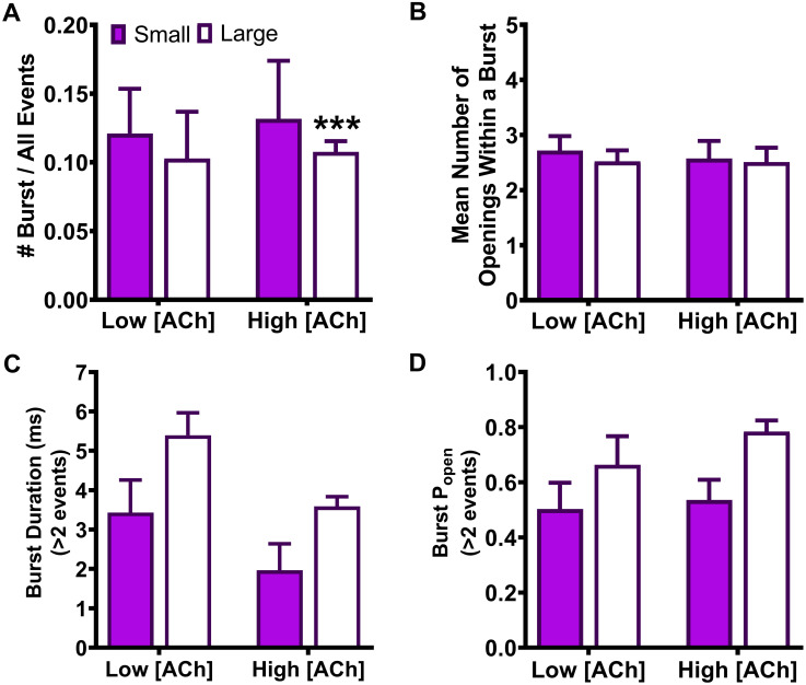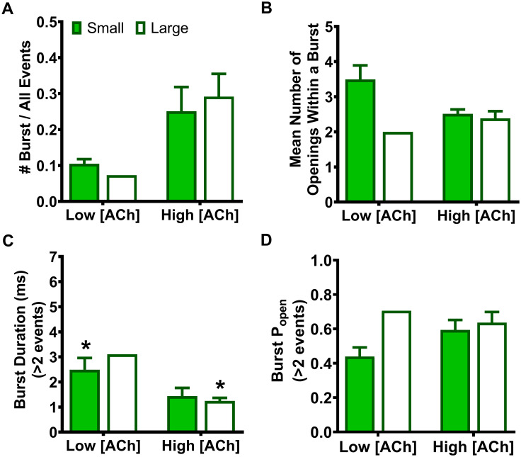 Fig 9. Human LS-isoform α4(R336H)β2-nAChR small and large amplitude burst properties.LS-isoform α4(R336H)β2-nAChR were expressed in Xenopus laevis oocytes. Function was evoked using 0.7 or 30 μM ACh and properties of the resulting bursts of open events were measured. (A) The proportions of small or large amplitude openings falling within bursts (as a fraction of the total numbers of each type of open event) were determined. (B) The mean number of openings per burst of LS-isoform α4(R336H)β2-nAChR was determined. (C) The durations of LS-isoform α4(R336H)β2-nAChR small or large amplitude bursts were measured at the low (0.7 μM) and high (30 μM) ACh concentrations. Noted statistical differences refer to the difference between the receptor property measured for LS-isoform α4(R336H)β2-nAChR versus its wildtype counterpart (i.e. fold change). (D) The Popen within bursts was also measured for bursts of small or large amplitude openings evoked from LS-isoform α4(R336H)β2-nAChR in the presence of the low or high ACh concentrations. Histograms within each panel show pooled data which were collected from 5 or 8 individual patches, respectively, across at least three separate experiments. Values and error bars represent the mean ± SEM of values across patches, and are summarized in Table 7, along with the statistical analyses applied. |