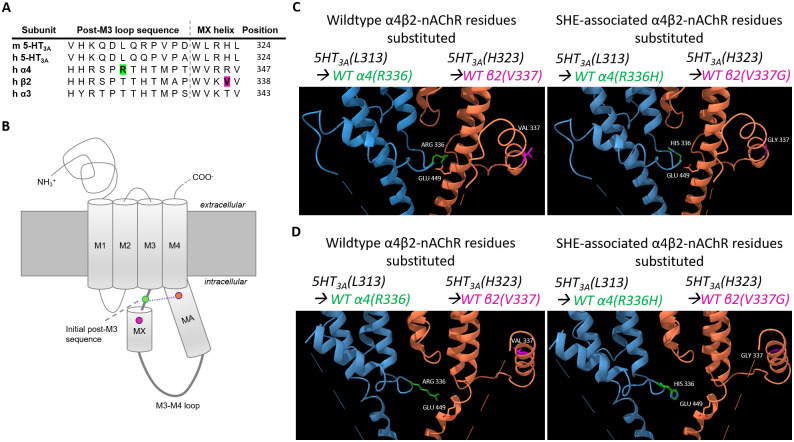 Fig 11. Illustration of the α4(R336H)β2- and α4β2(V337G)-nAChR SHE-associated mutant locations substituted into the known cryo-EM structures of 5-HT3AR apo and conducting states.(A) Sequence alignments of 5-HT3AR and nAChR subunits are displayed with numbering based on a start at the translation initiation methionine. The locations of the intracellular loop SHE-associated mutations are highlighted. The α4(R336H) mutation (green) is located in the initial portion of the M3-M4 loop, whereas the β2(V337G) mutation (magenta) is located in the MX helix. (B) Schematic of the major structural domains of a single nAChR subunit. The large extracellular N-terminal agonist-binding domain is followed by four transmembrane helices (M1âM4). The major intracellular domain is located between the M3 and M4 helices and consists of a short initial portion of sequence that connects the M3 helix to the MX helix, the MX helix itself, an extended region of undefined structure, followed by the final M4 transmembrane helix. The locations of both SHE-associated mutations are shown in the initial portion of the M3-M4 domain and the MX helix subdomain of the major intracellular domain, along with that of a likely interacting residue in the MA helix (β2E449; orange, putative interaction denoted with a dotted blue line). Note that β2E449 is not shown in Panel A since it is located far in the linear sequence from the MX helix. (C) The apo (non-ligand-bound; PDB ID: 6BE1) state of the recent cryo-EM structure of the 5-HT3AR [45] was used as the basis to illustrate the locations of the α4(R336H)β2- and α4β2(V337G)-nAChR mutations, since equivalent structural information is not yet available for these intracellular regions of α4β2-nAChR. Position numbers refer to those of the human α4 or β2 nAChR subunit, as shown in the accompanying sequence alignment. Left Panel depicts the positioning of wildtype nAChR α4(R336) and β2(V337) residues, substituted into the known 5-HT3AR structure. The location of the initial portion of the M3-M4 domain, followed by the MX, MA, and M4 helices are labeled. Right Panel illustrates the locations of the SHE-associated α4(R336H) and β2(V337G) residues in the same context. Also shown in both panels is the location of the β2E449 residue thought to interact with α4(R336). (D) Same as (C), except that the residues of interest are substituted into the conducting (ligand-bound; PDB ID: 6DG8) 5-HT3AR cryo-EM structure [31]. Note the upward movement of the MX helix in the conducting, compared to apo, state. |