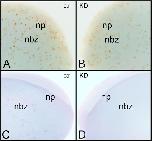 Fig. 3. Mcrs1 knock-down reduces apoptosis but does not affect proliferation. (A) Side view of stage 16 embryo (anterior to right, dorsal to top) showing pH3-labeled nuclei (brown) in the rising folds of the neural plate (np) and neural border zone (nbz) on the control (ctrl) side. (B) Side view of the same embryo (anterior to left, dorsal to top) on the S-MOs injected (KD) side. (C) Side view of stage 16 embryo (anterior to right, dorsal to top) showing TUNEL-labeled nuclei (dark blue) in the rising folds of the neural plate (np) and neural border zone (nbz) on the control (ctrl) side. (D) Side view of the same embryo (anterior to left, dorsal to top) on the S-MOs injected (KD) side. |